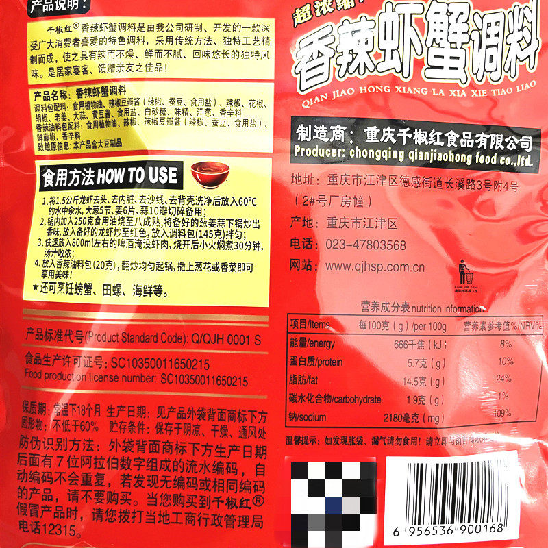 油焖大虾香辣蟹螺丝佐料 重庆火锅料 千椒红香辣虾蟹调料165g 5袋