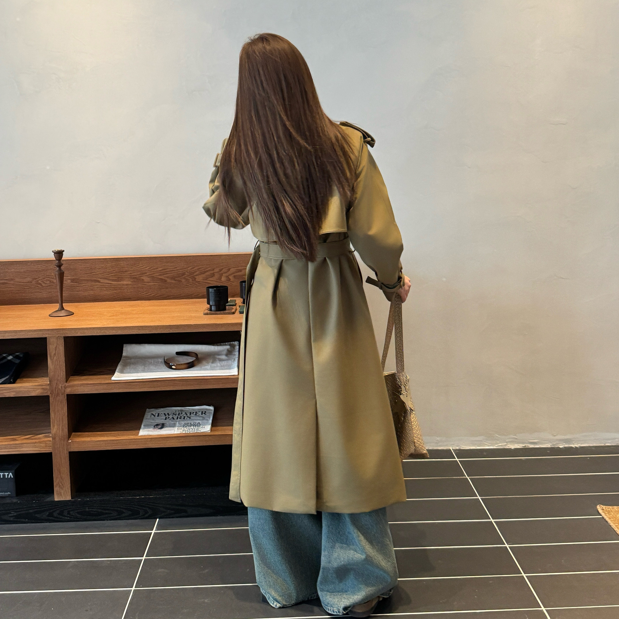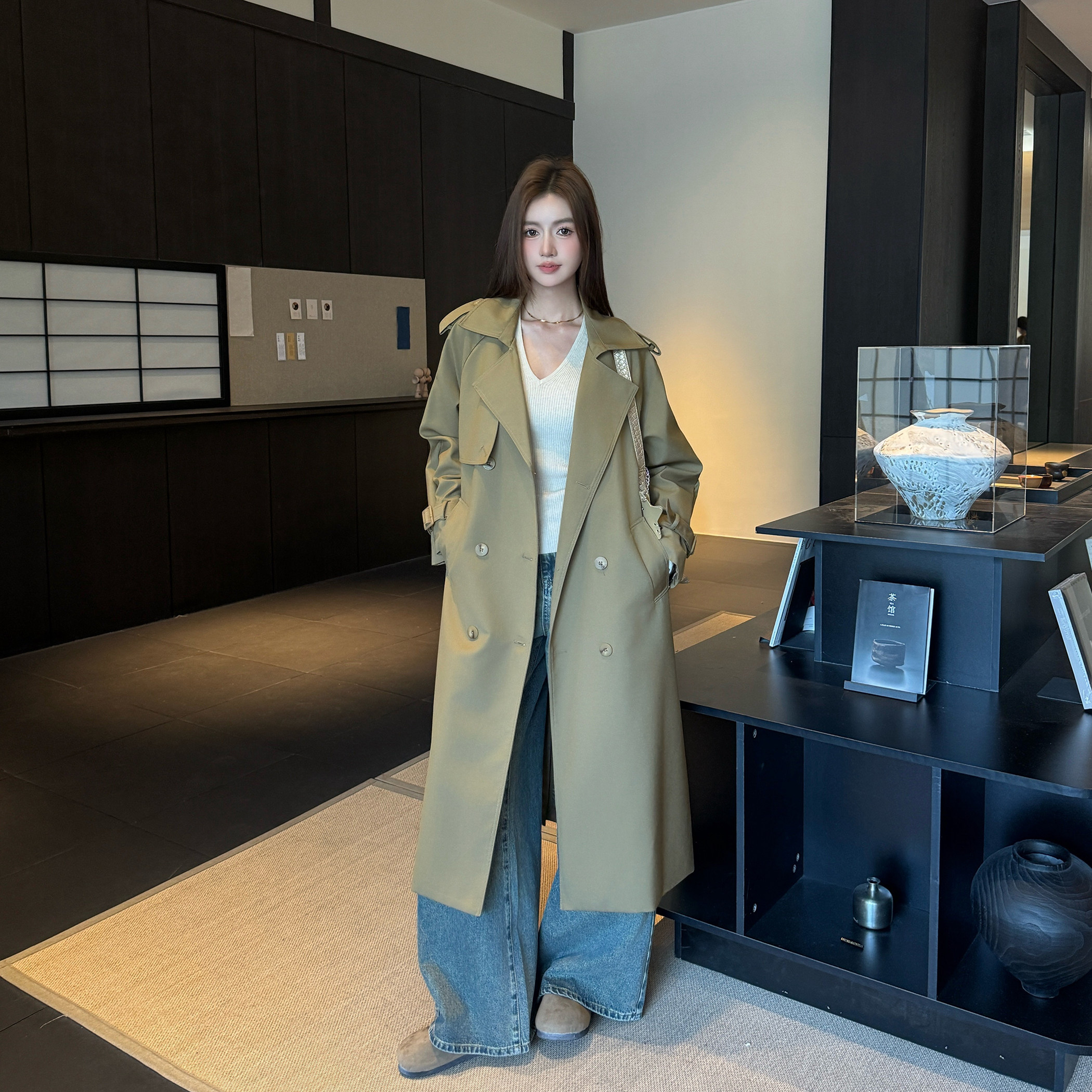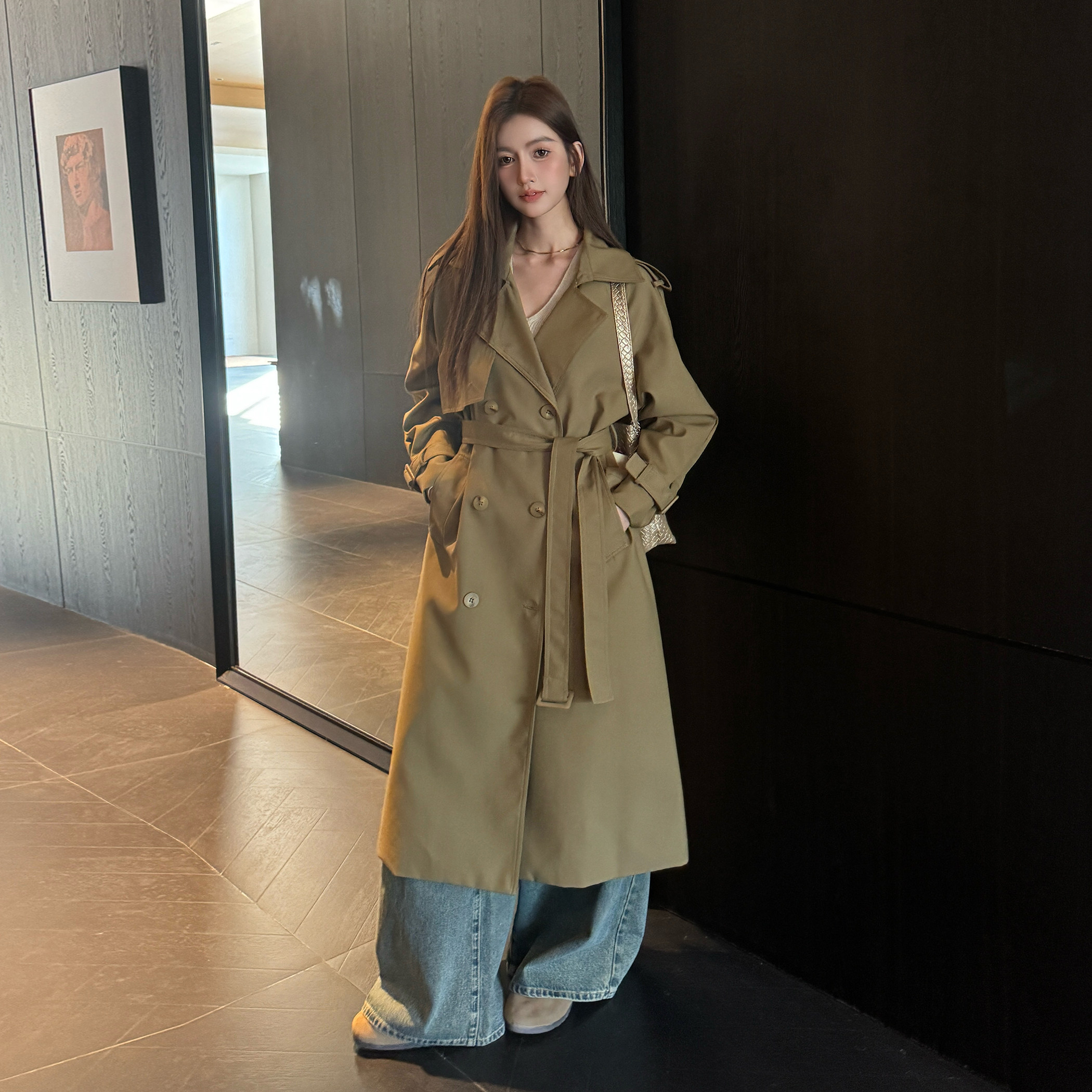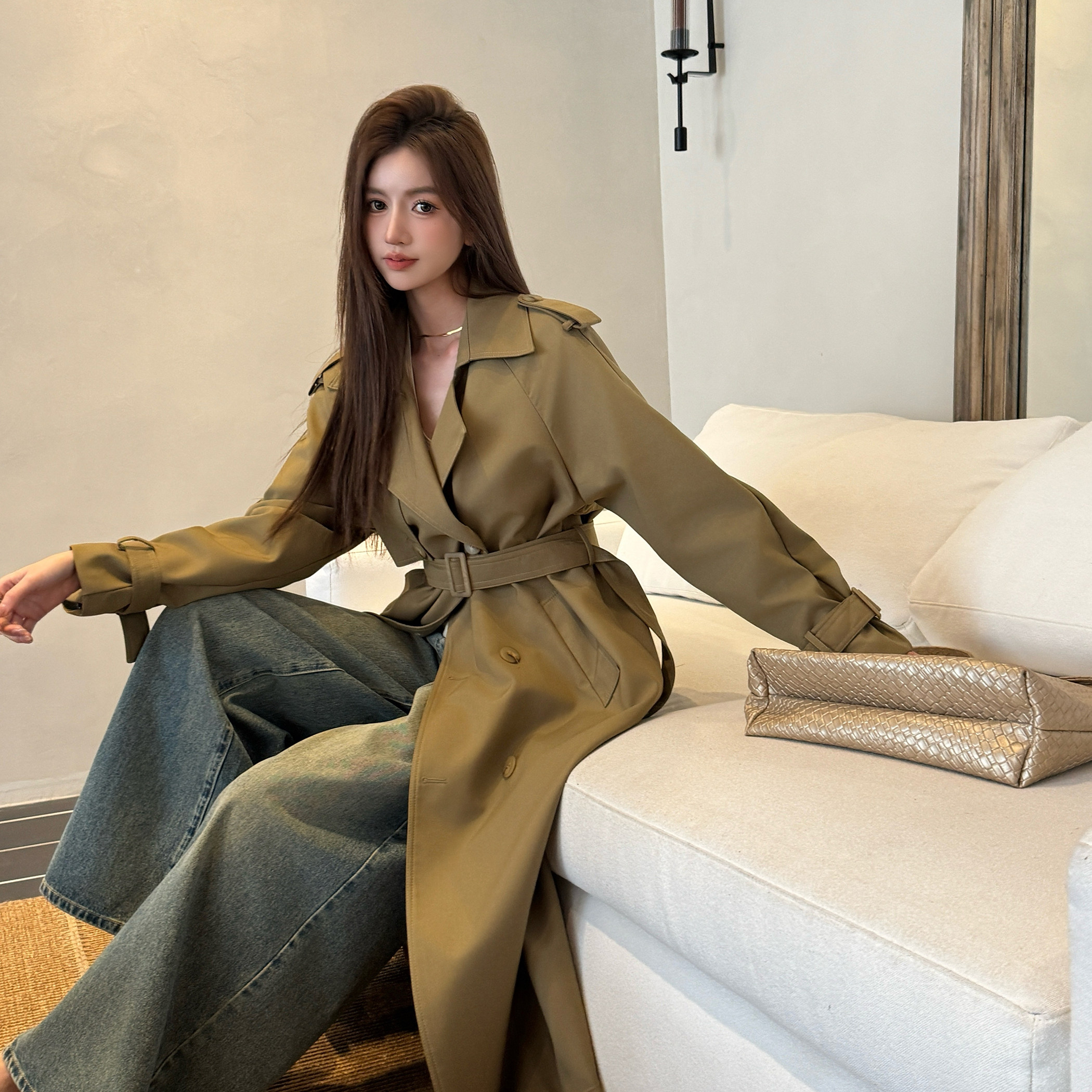 高级感气质大衣 风衣外套女双排扣系带收腰加长款 浅布调春装 中长款