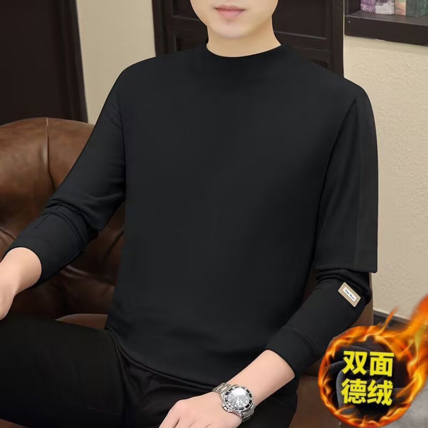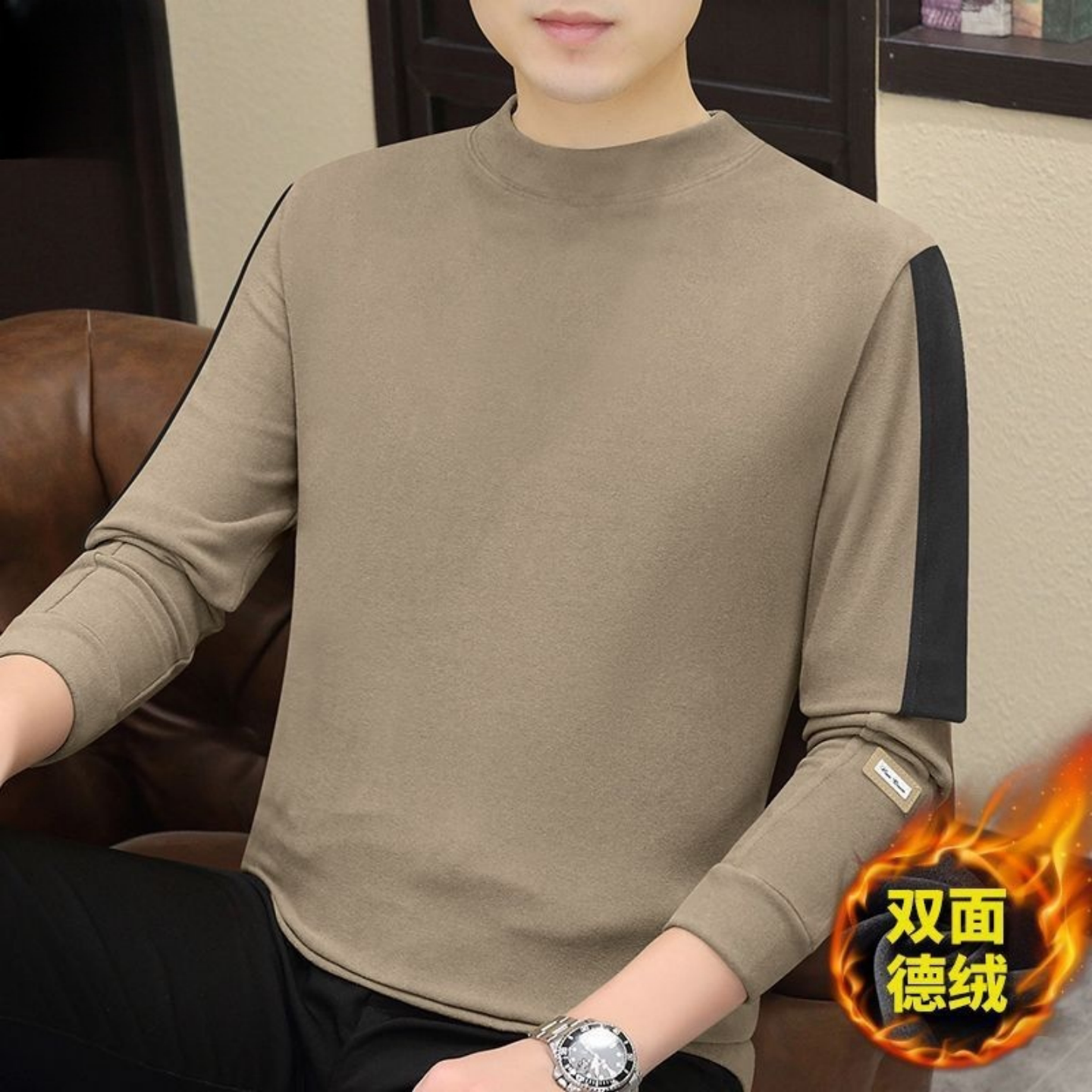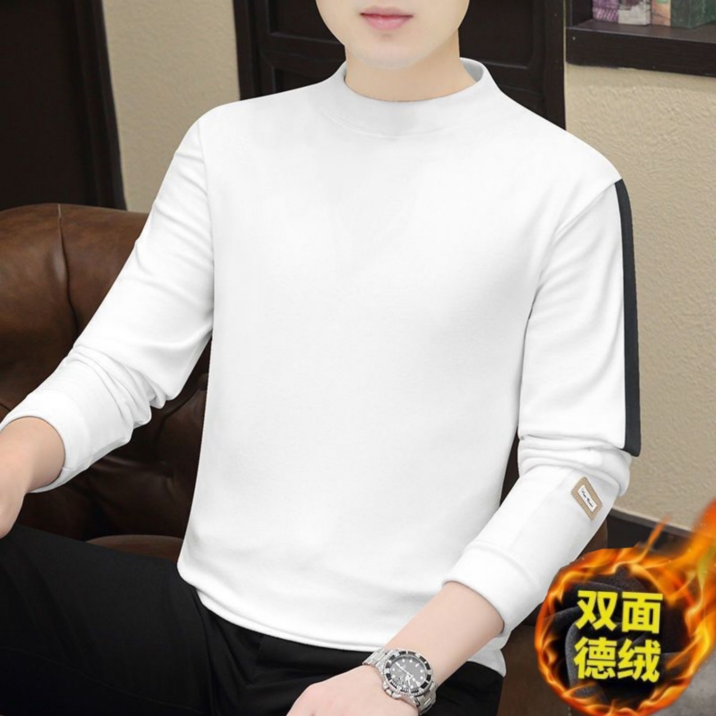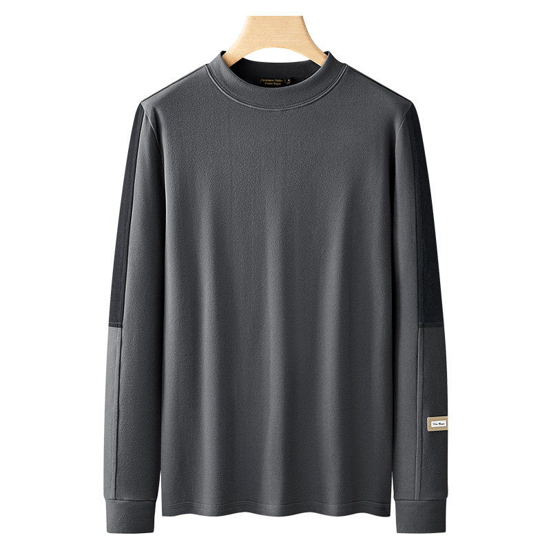 拼色上衣T恤保暖半高领 加厚长袖 自发热双面德绒男生打底衫 秋冬季