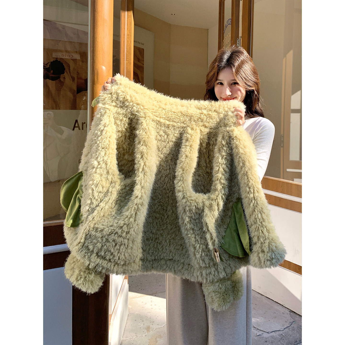 巨好看短款 加绒加厚棉服 果绿色皮毛一体羊羔毛外套女秋冬2025新款