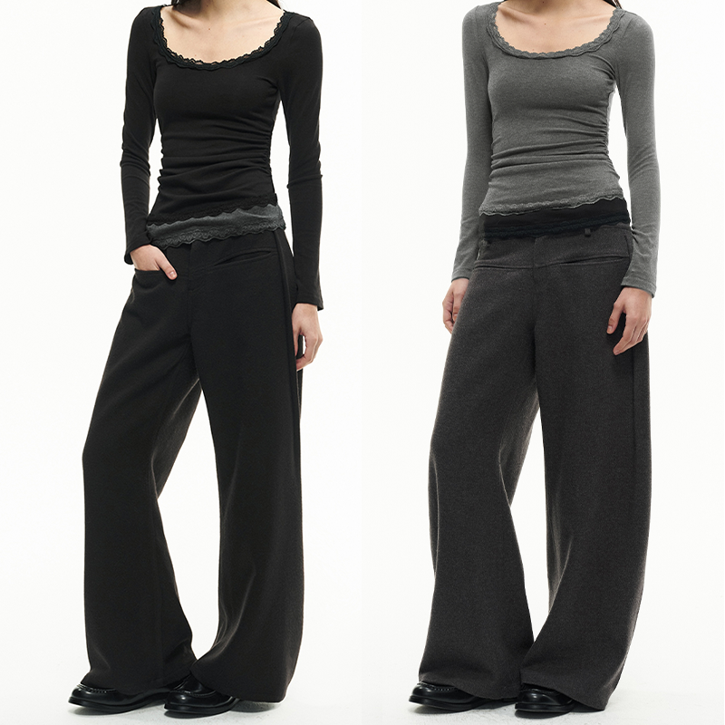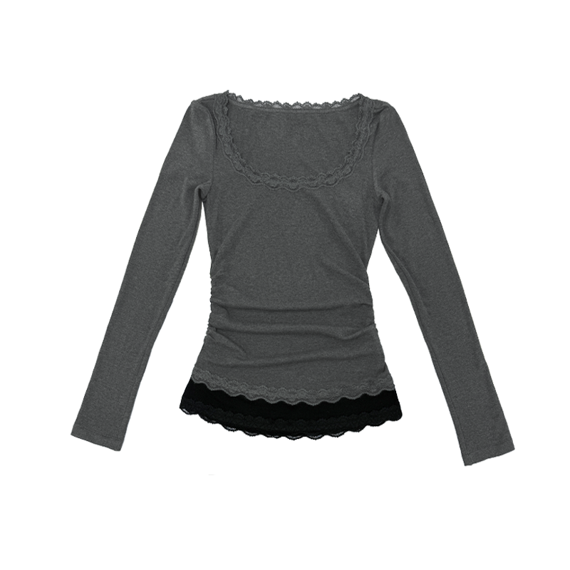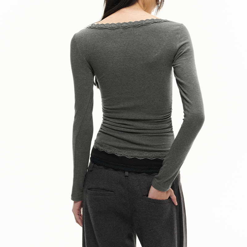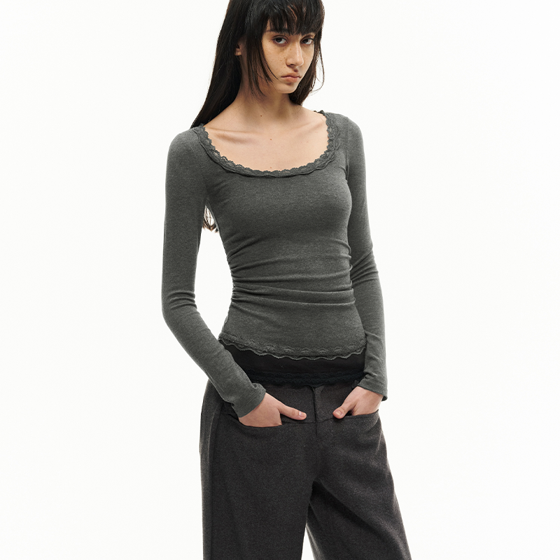 大u领修身 JCAESAR 美利奴羊毛混纺 打褶蕾丝拼接打底衫 T恤 WOMEN