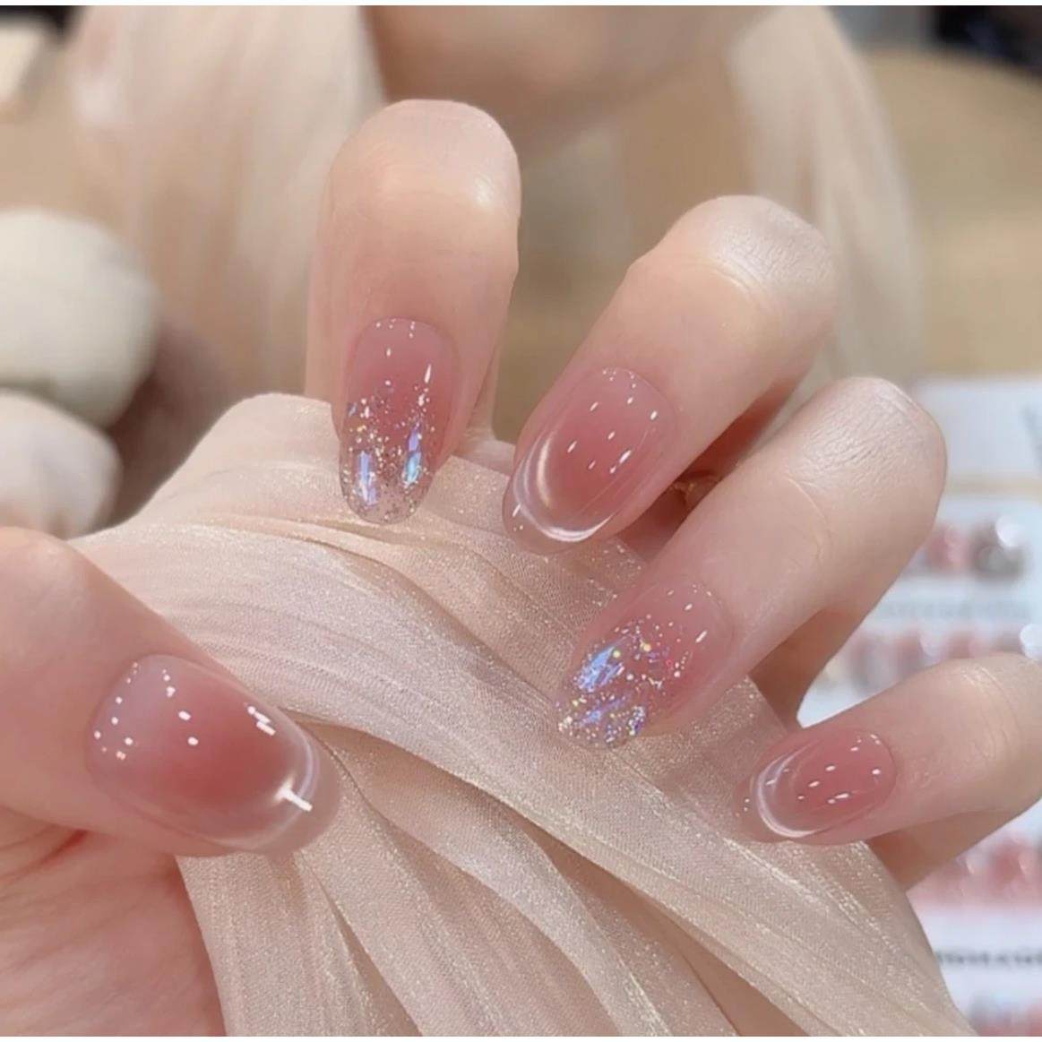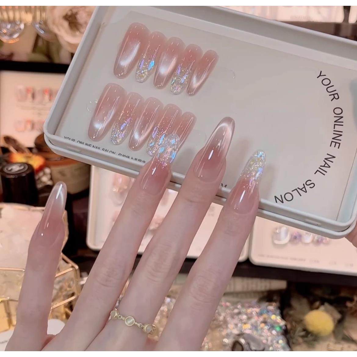 裸色纯手工穿戴甲气质显白中长款 彩色极光微笑猫眼美甲可拆卸贴片