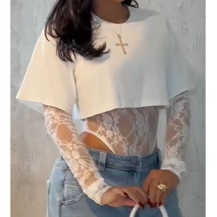 女性感纯圆领短袖 套装 连衣裤 shirt 超短高腰T恤连体打底蕾丝长袖