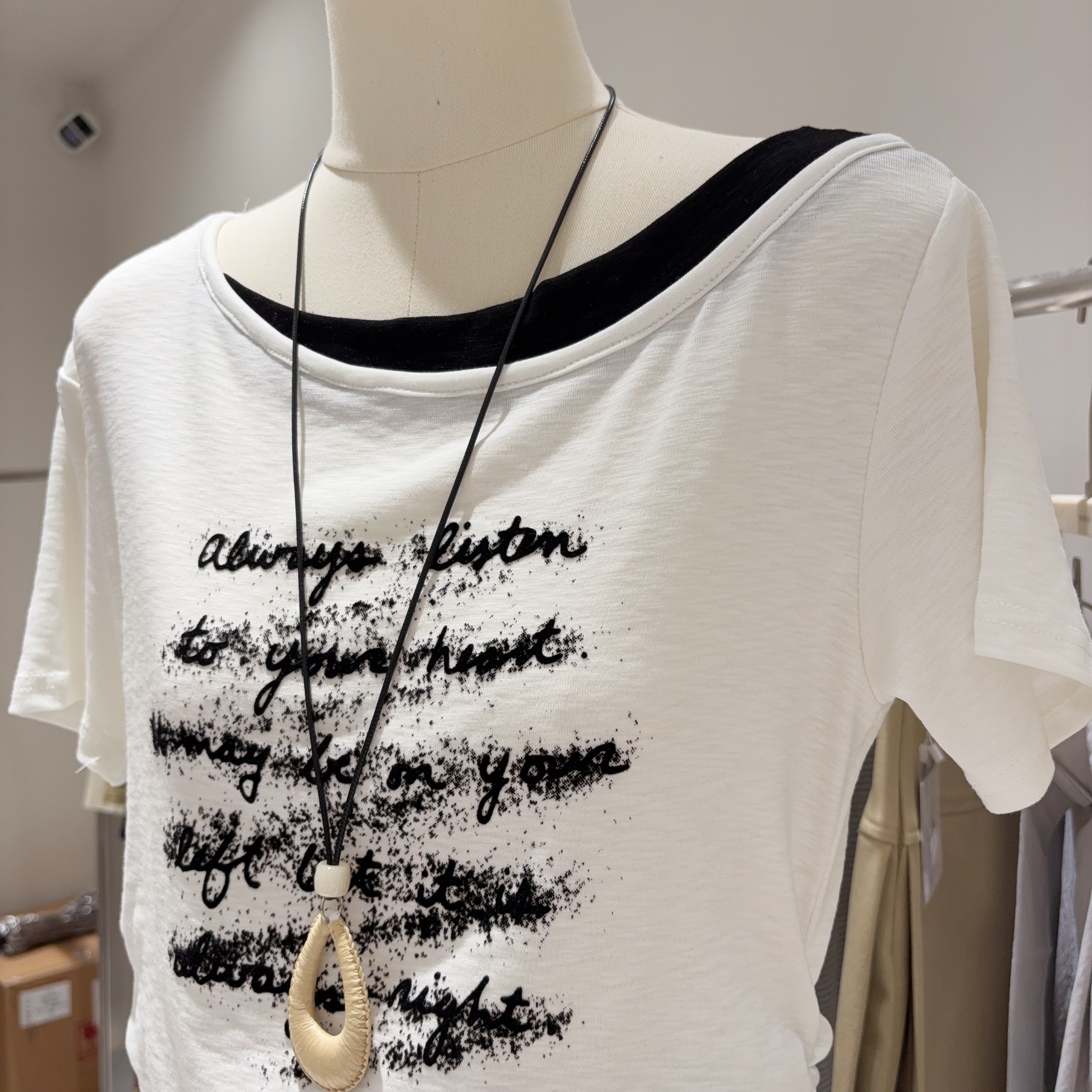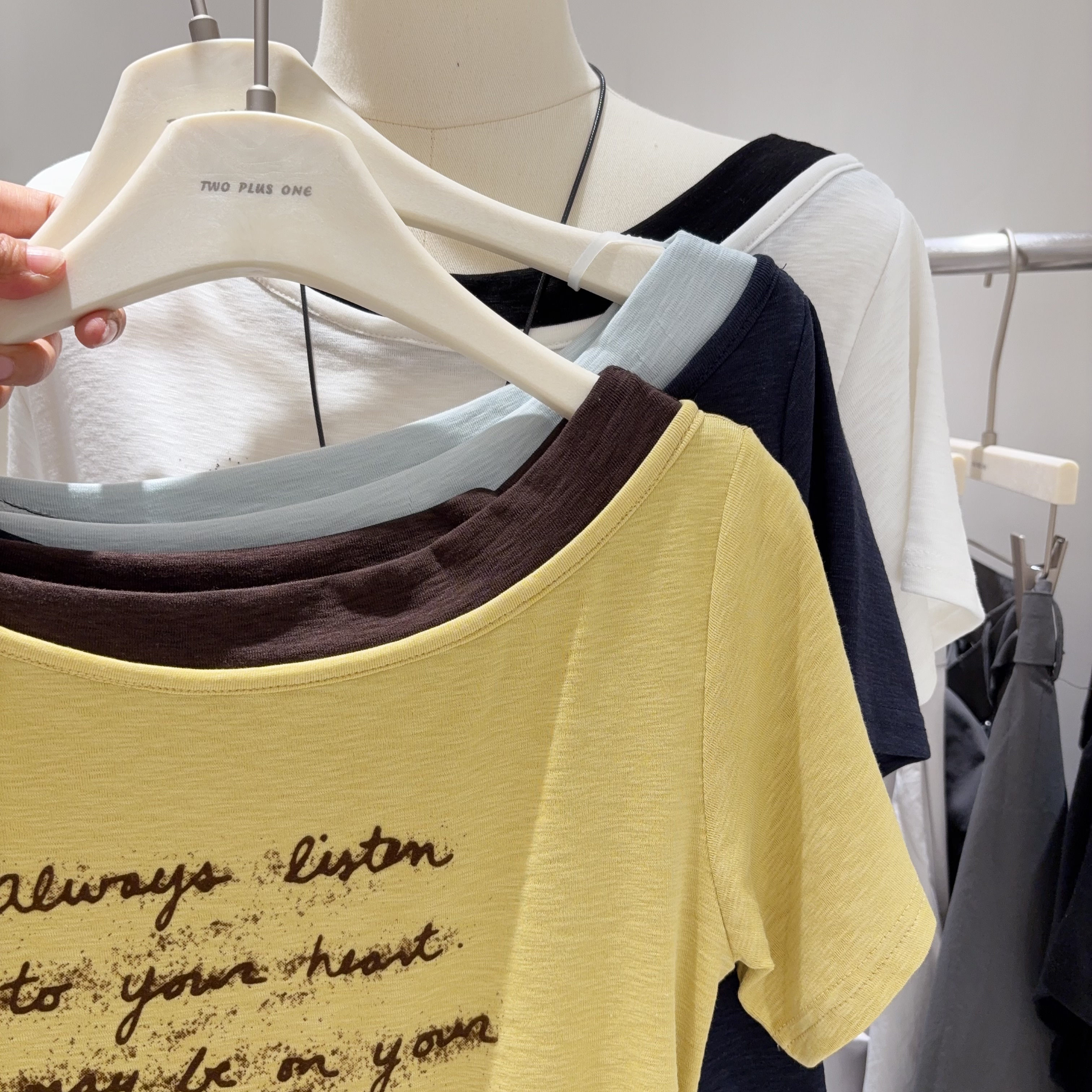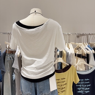 小众时髦精 T恤女褶皱显瘦上衣小个子 拼色斜肩一字领字母印花短袖