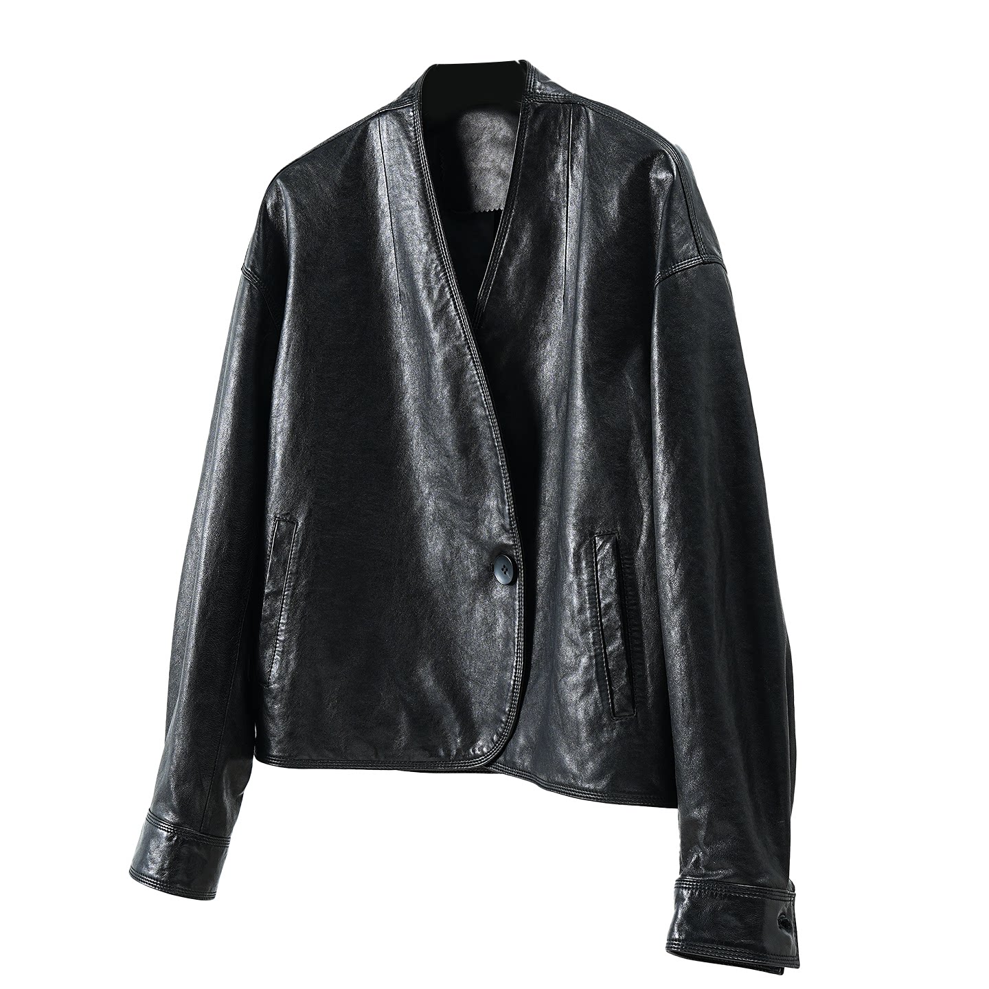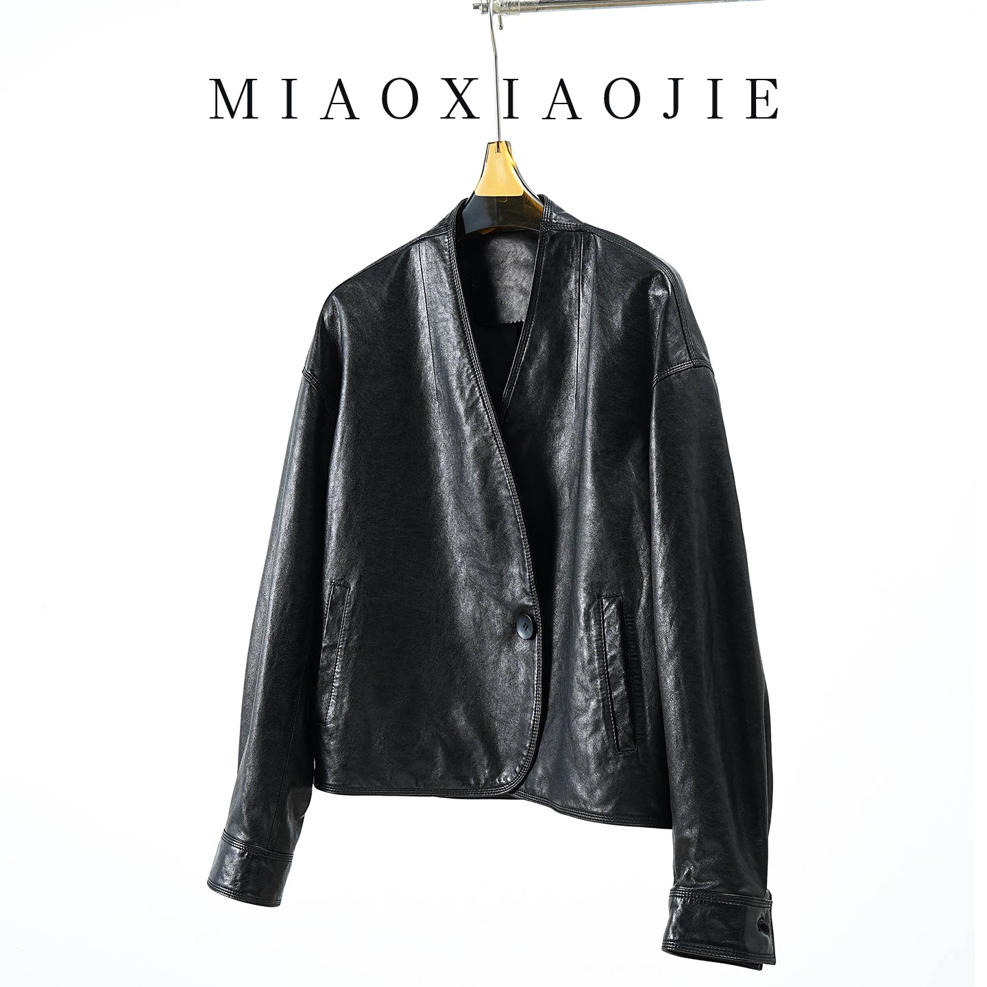 高级感油蜡头层2026超火真皮皮衣外套女绵羊皮短款 宽松皮夹克v领