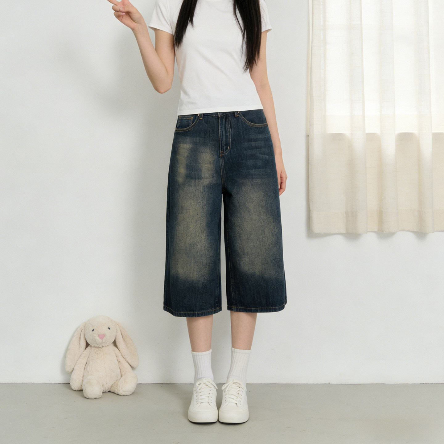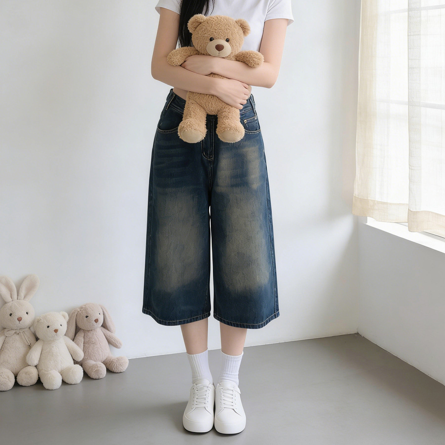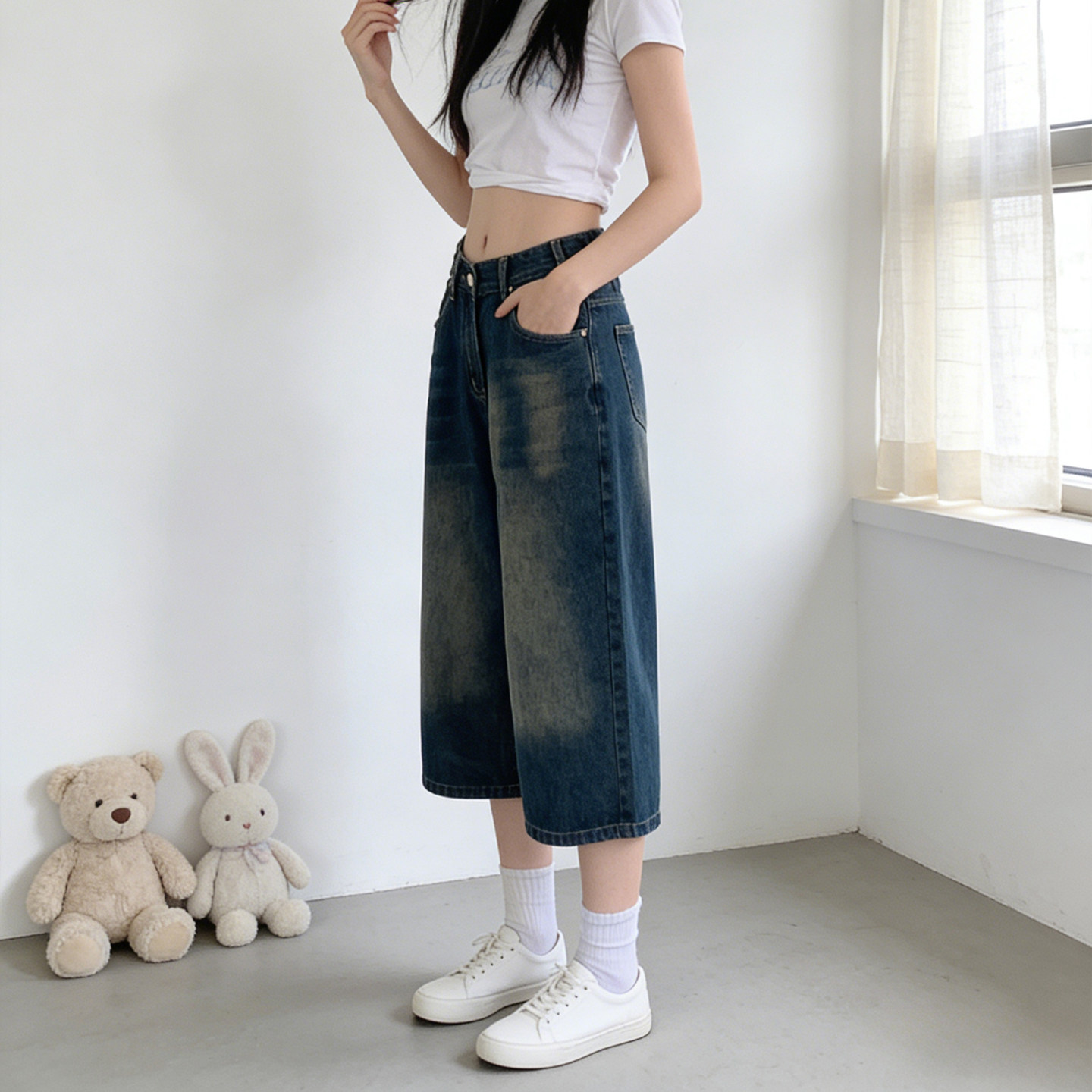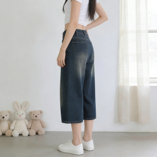 女阔腿显瘦宽松百搭裤 2026夏季 复古做旧七分牛仔裤 胖mm美式 子 大码