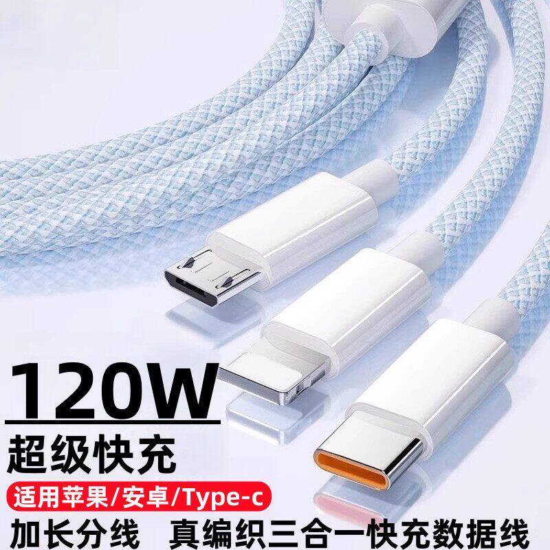充电器数据线编织一拖三多头车载套装 120w三合一超级快充多口正品 适用苹果安卓手机通用typec 国家3C认证