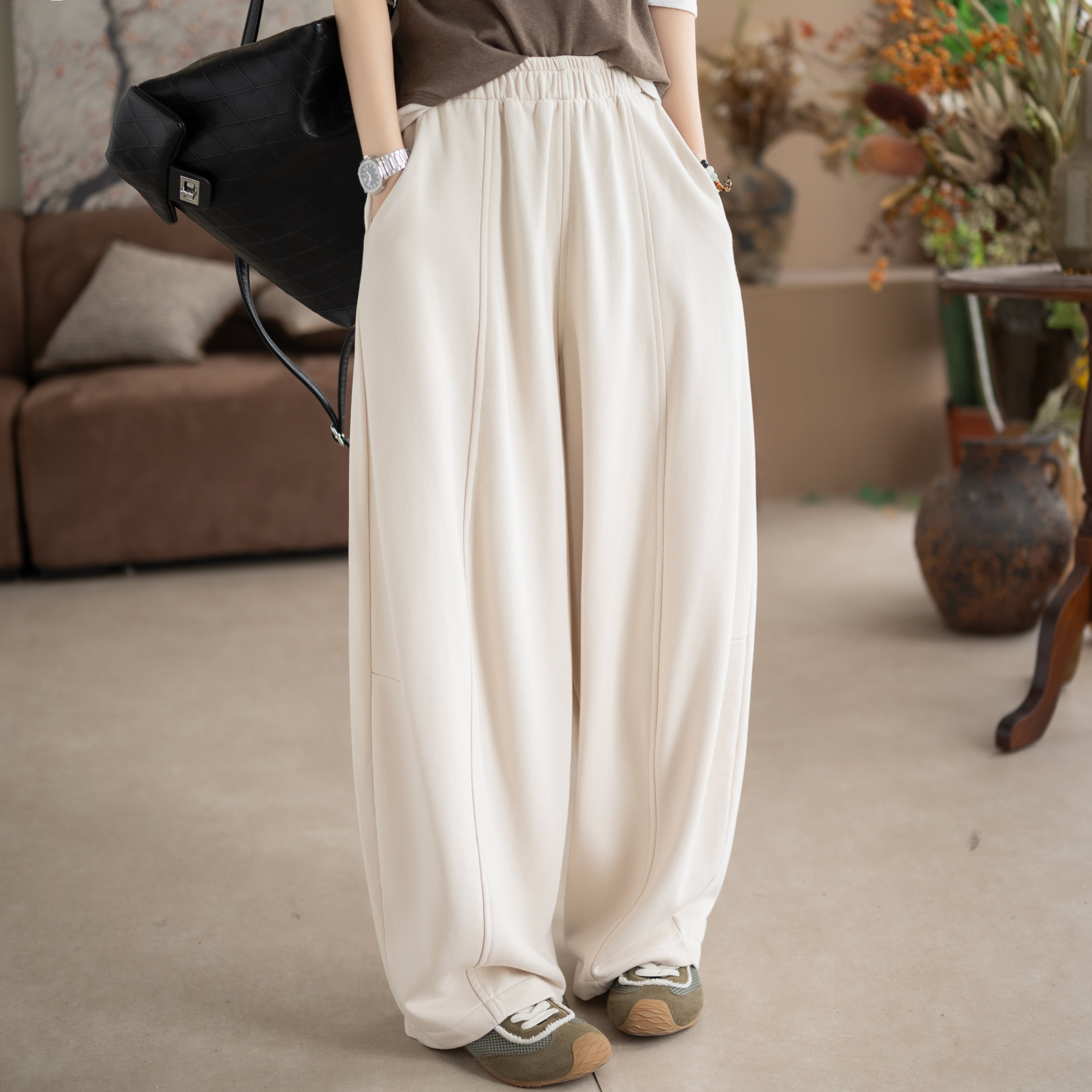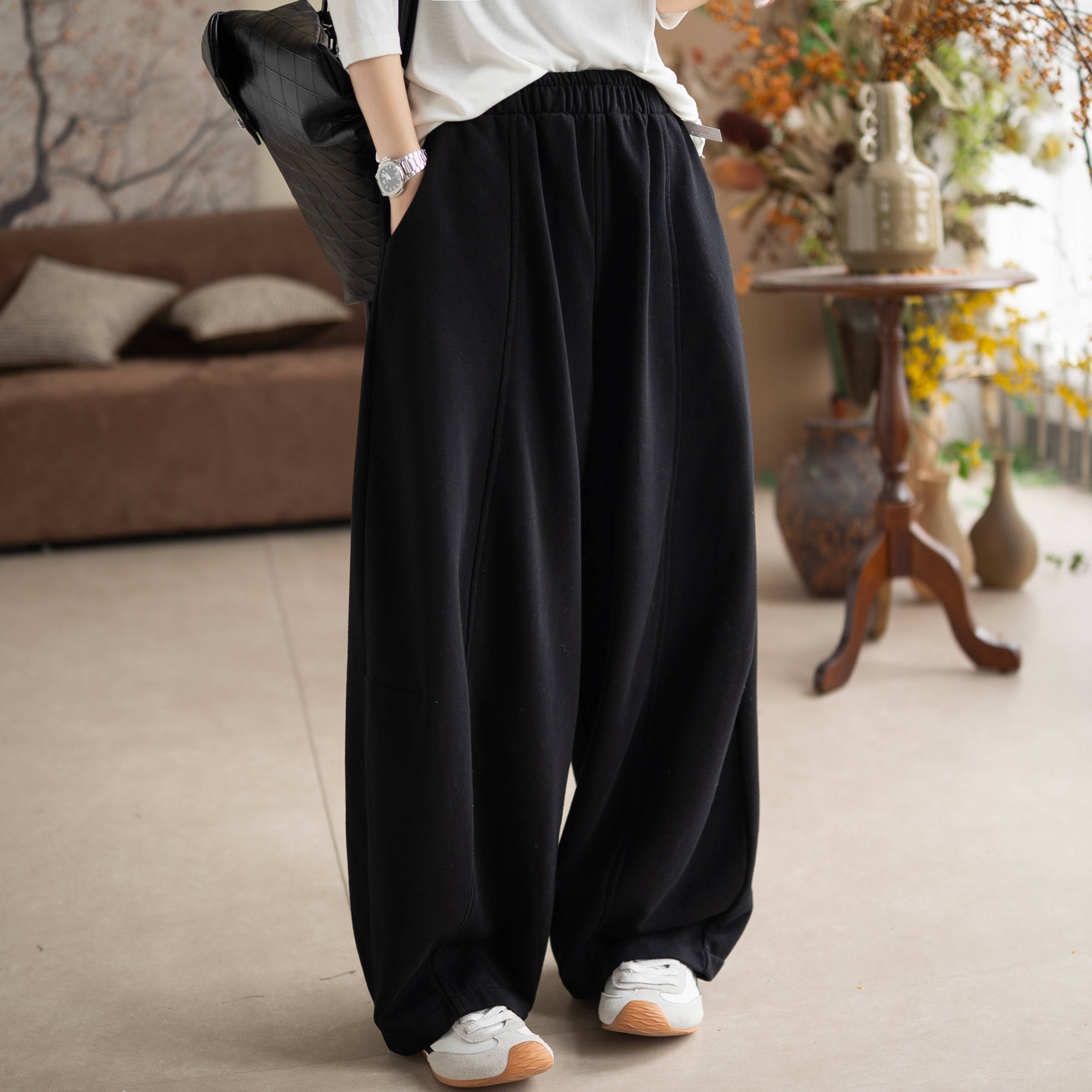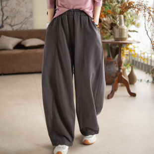 咖咪羽松弛感立体剪裁弯刀裤 女 宽松显瘦抽绳松紧腰休闲长裤