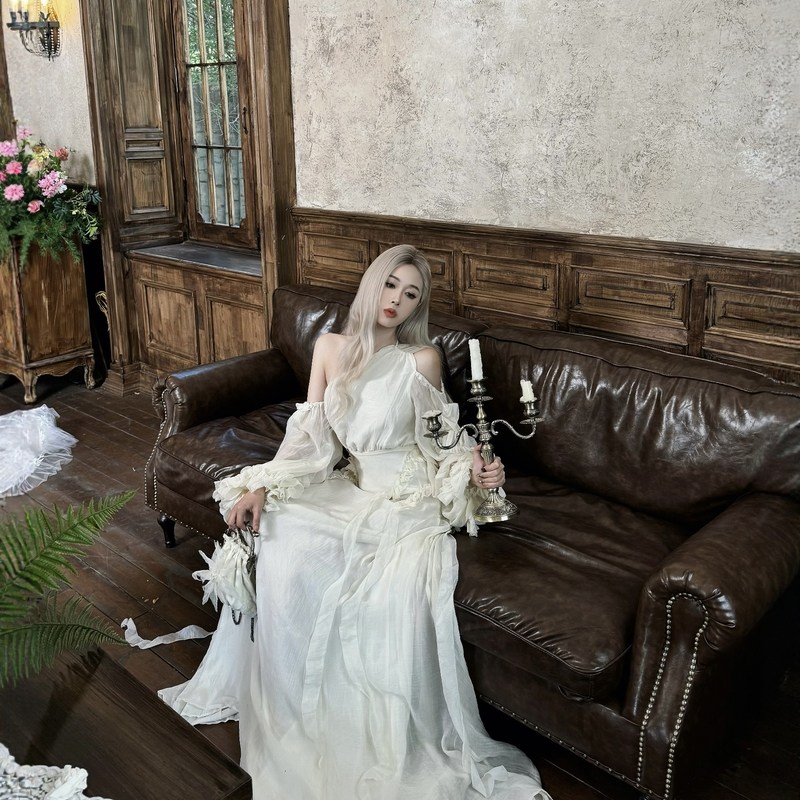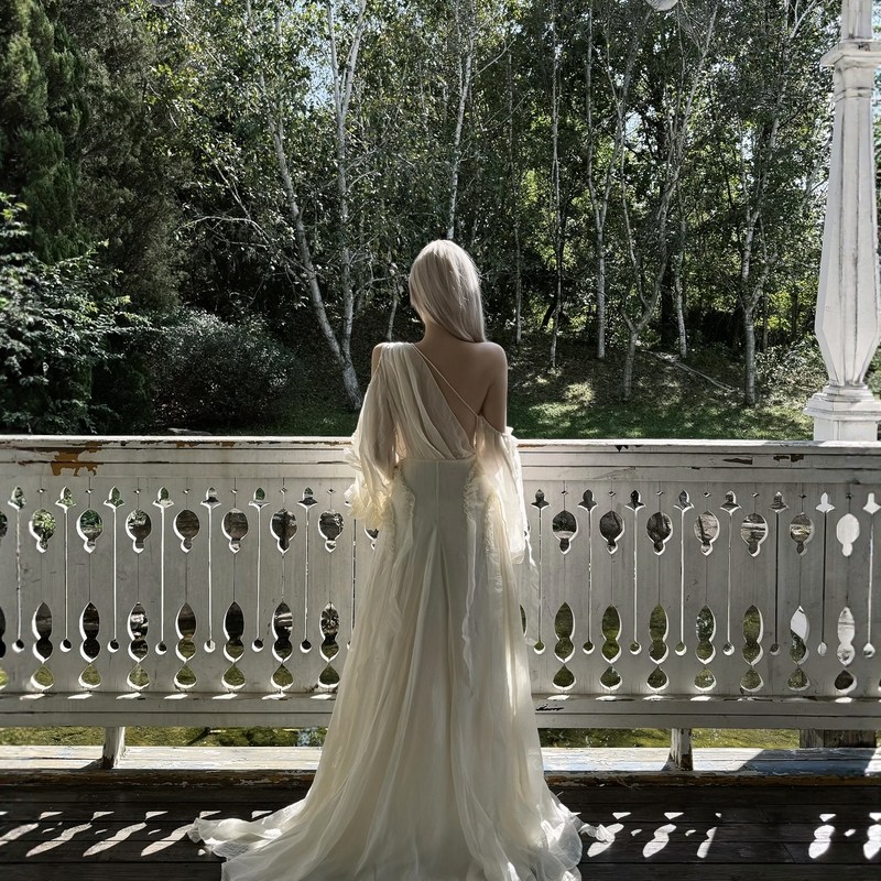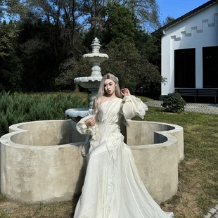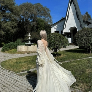 白里奶杏慕斯 V领皱褶温柔收腰长裙甜美风宽松显瘦百搭连衣裙 新款