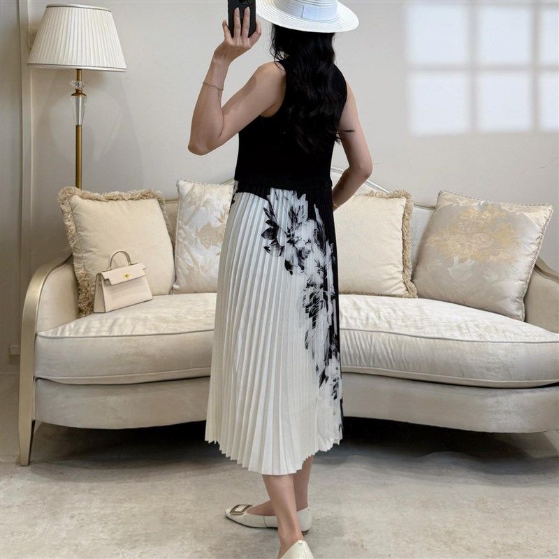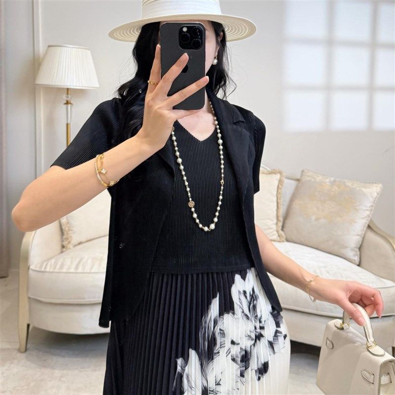 妈妈两件套套裙套 气质连衣I裙女装 水墨画褶皱西装 百褶裙显瘦时尚