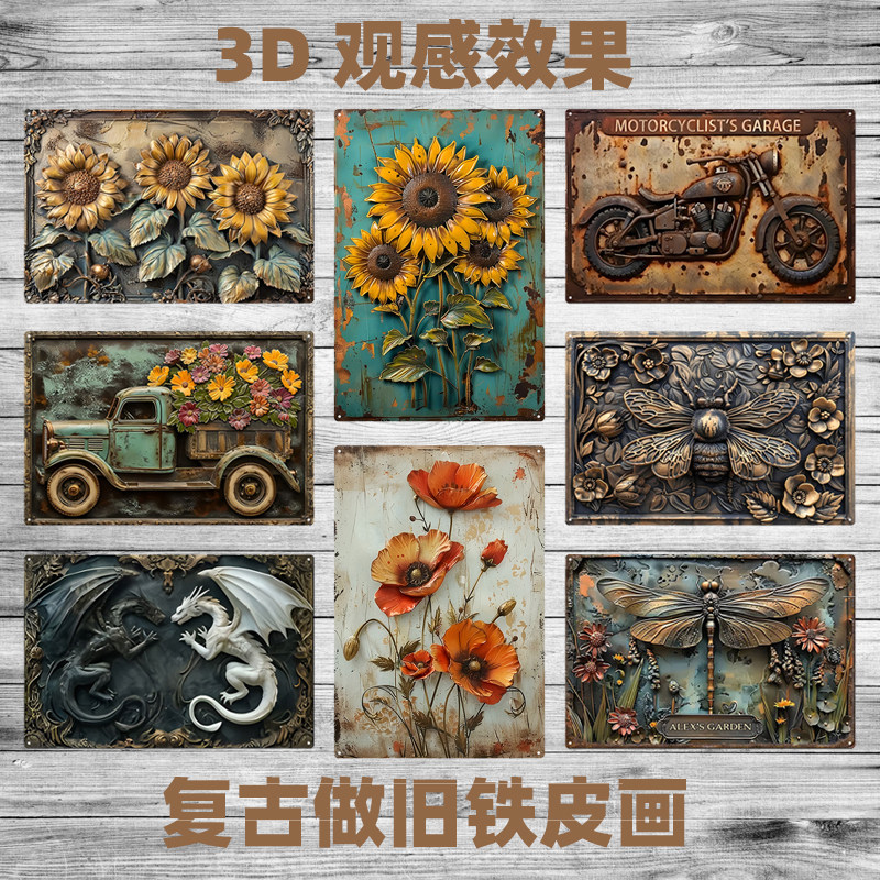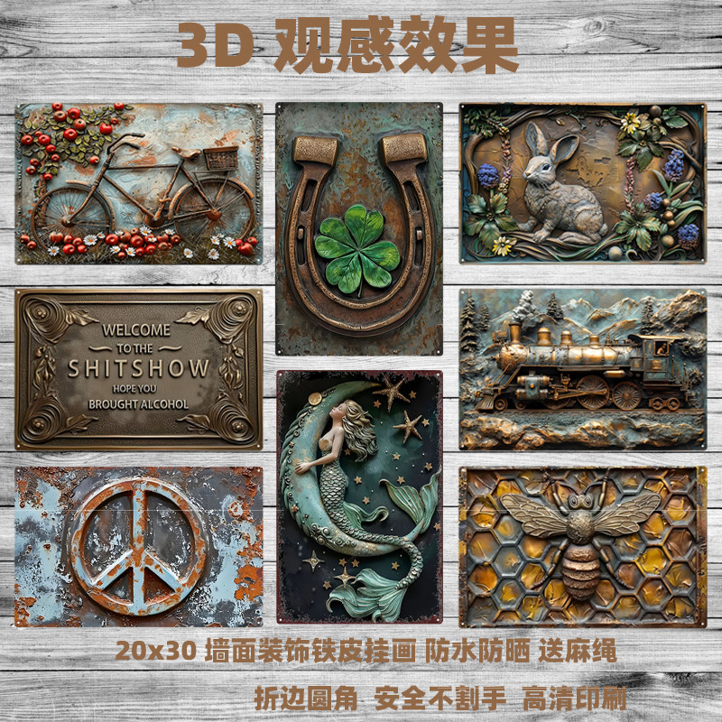 仿3D露营阳台酒吧墙面装 饰复古铁皮画铁艺壁饰布置摄影挂画挂件