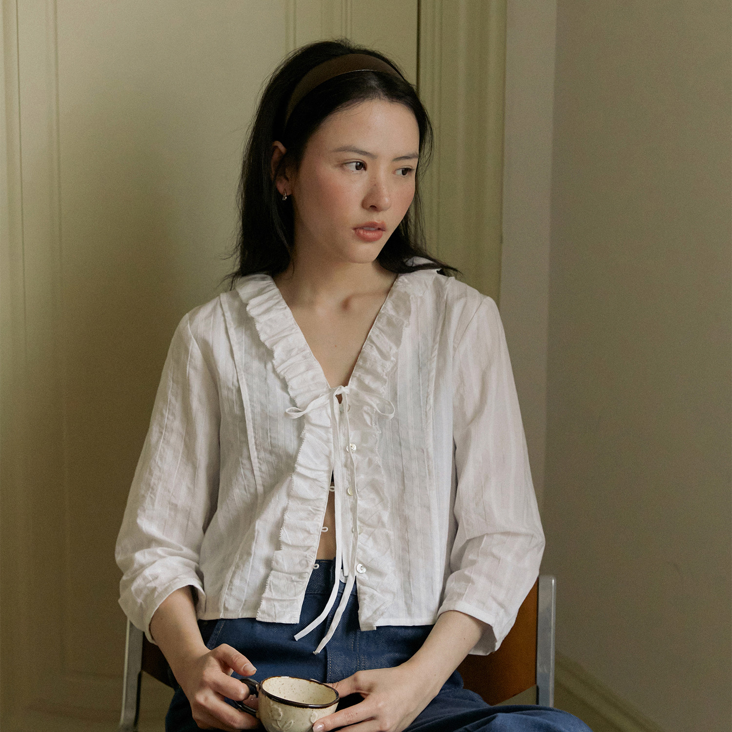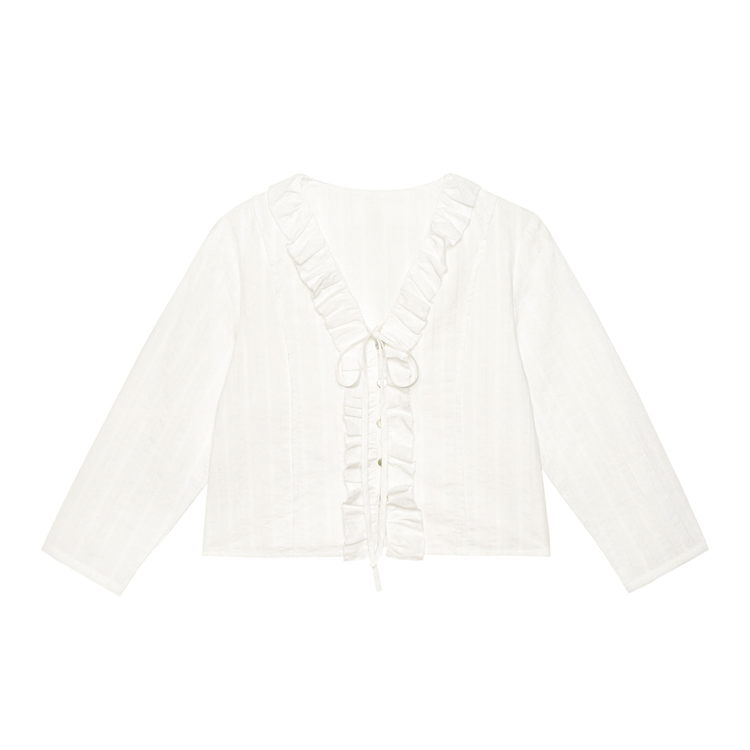 外搭上衣衬衣女春季 LLANO花边系带八分袖 复古灯笼袖 衬衫 上衣法式