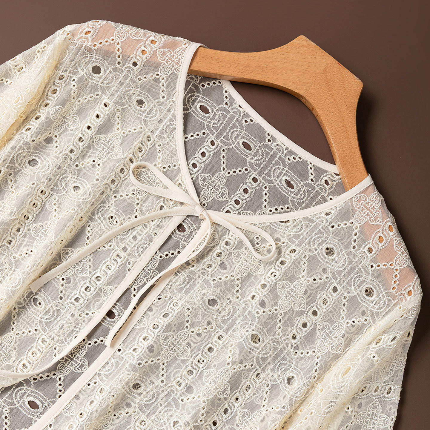 披肩半透视真丝外搭 亲肤镂空绣花系带七分袖 轻风迎面短款 防晒衫