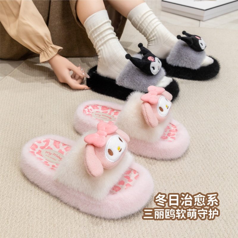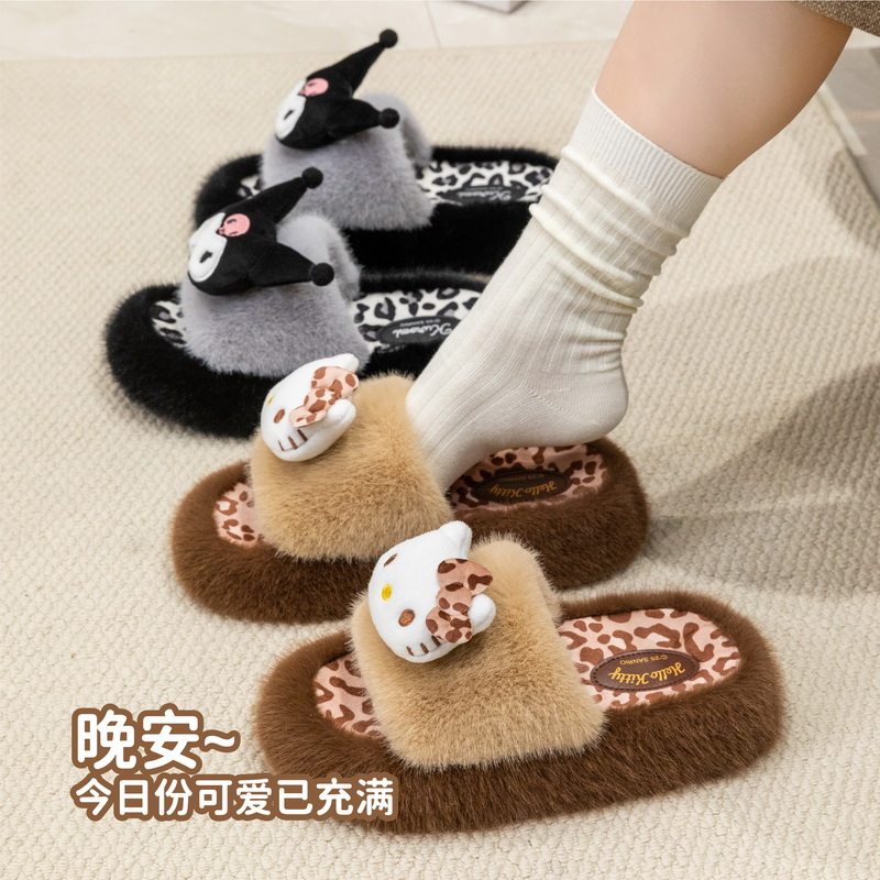 可爱少女心居家室内保暖毛毛拖鞋 三丽鸥正版 凯蒂猫豹纹毛绒棉拖鞋