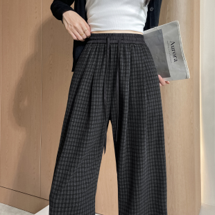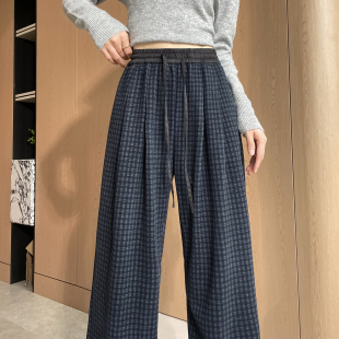 流行直筒宽松加长休闲长裤 舒适弹力针织格子阔腿裤 女小个子新春款