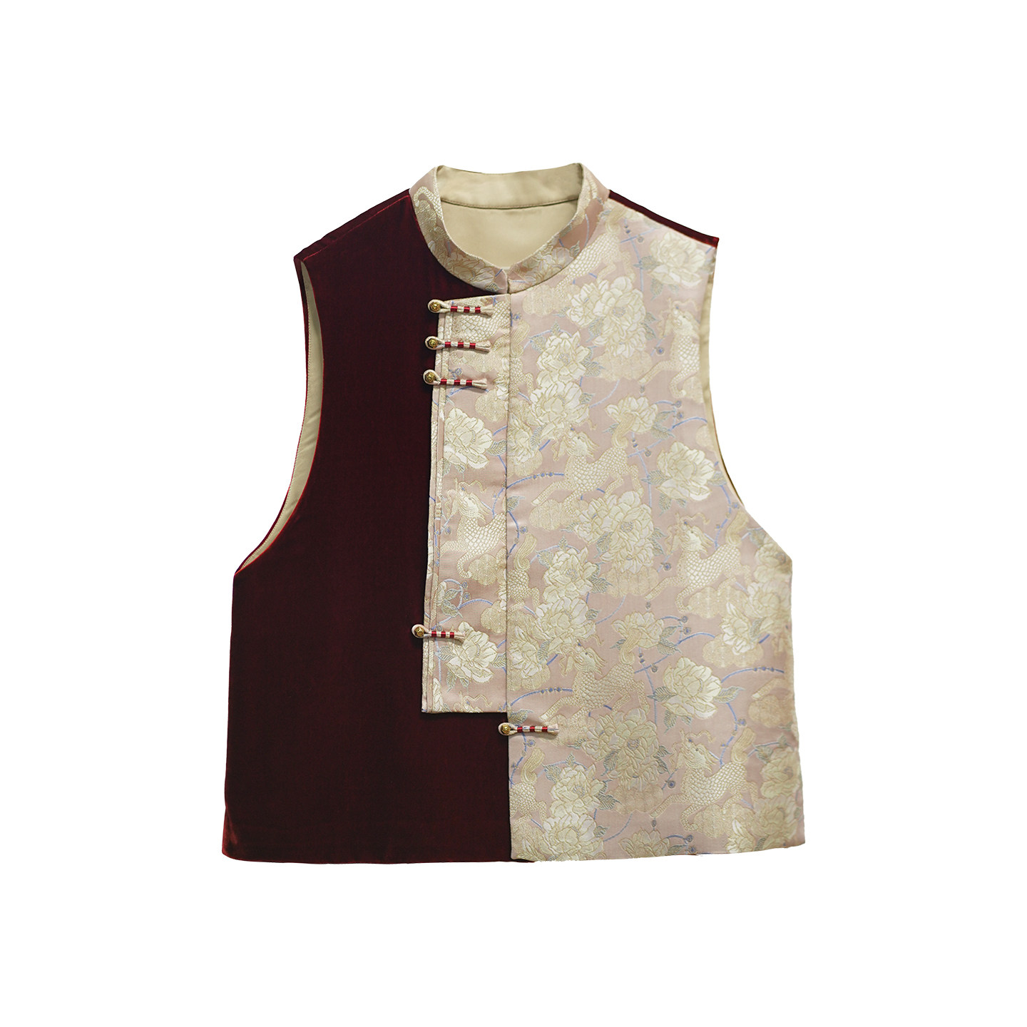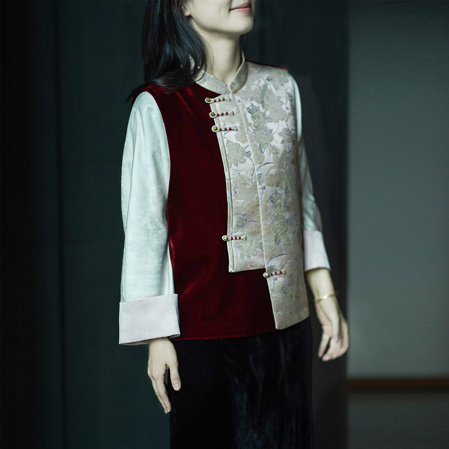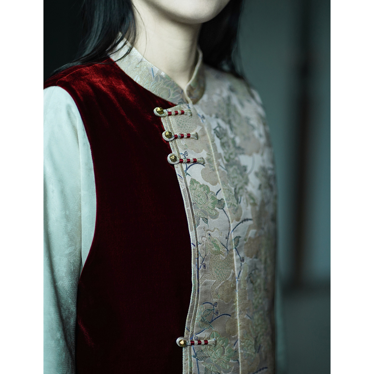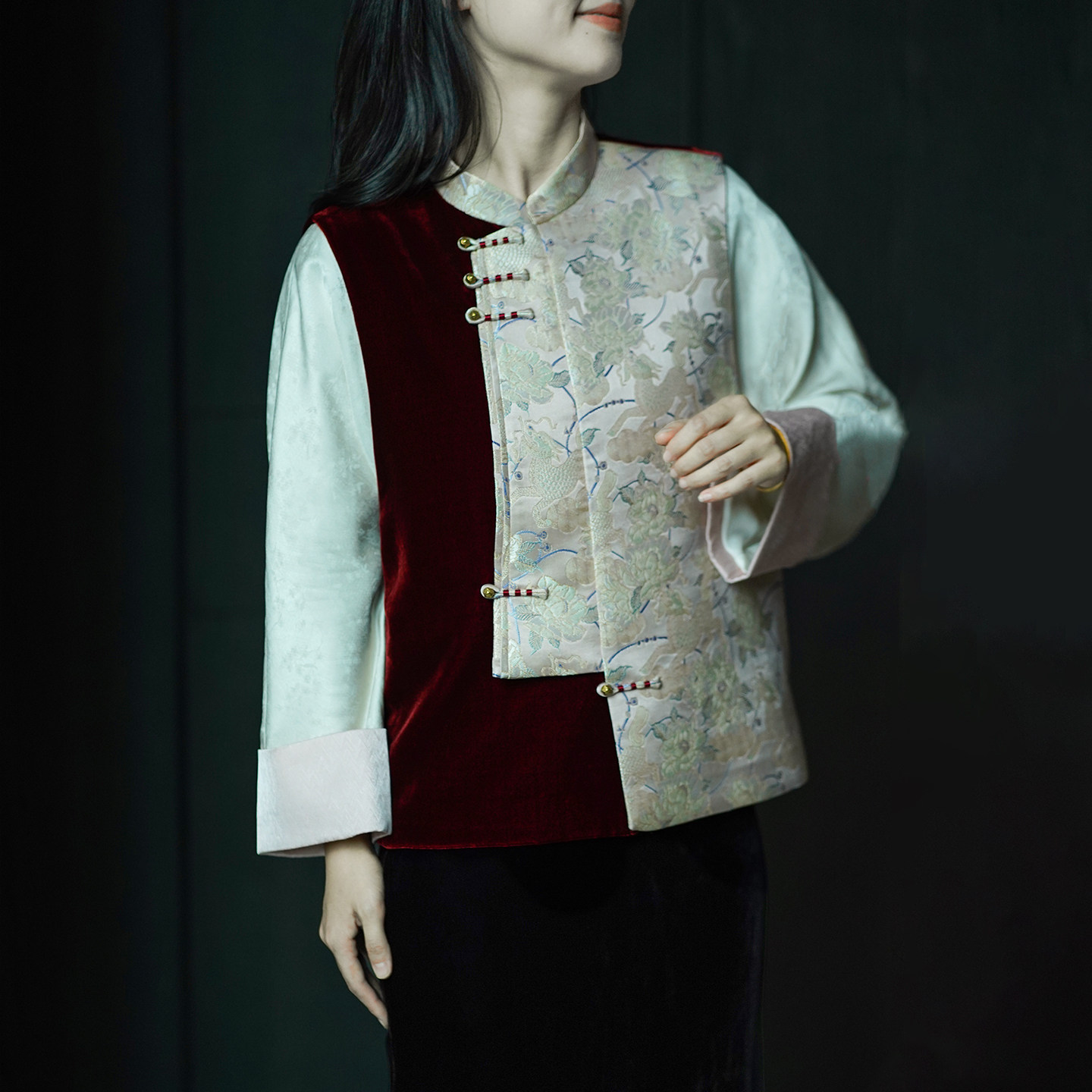 艾绘馆新中式 复古盘扣马夹坎肩 真丝丝绒拼接人丝宋锦马甲女秋冬季