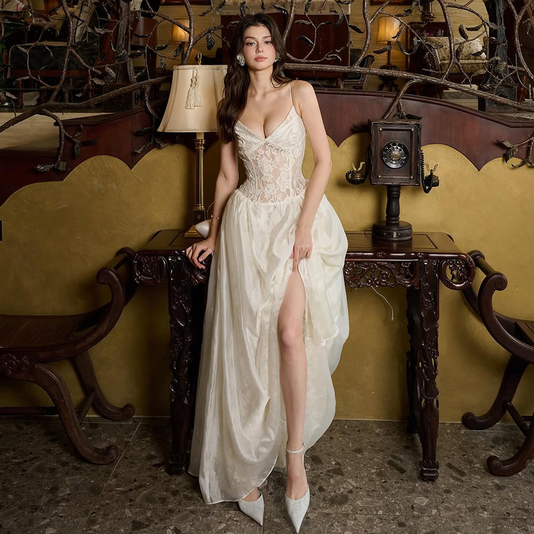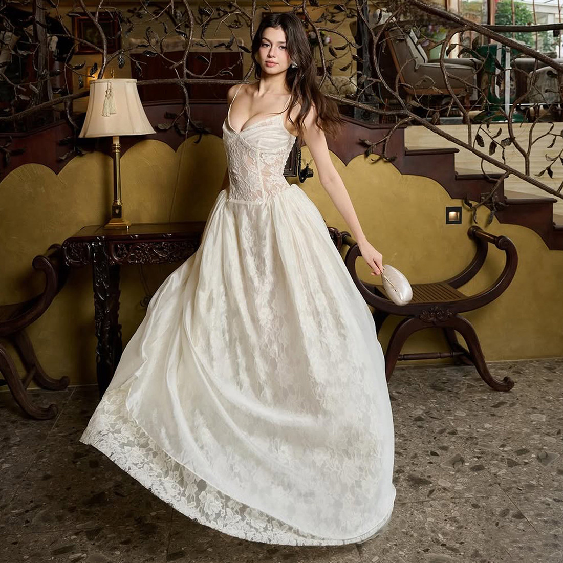 双层大裙摆长裙子 凡尔赛重工蕾丝拼接吊带连衣裙女 怪诞女孩 法式