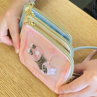 日系卡通可爱鲨鱼猫刺绣网纱卡包透明可伸缩零钱包钥匙包随身挂饰