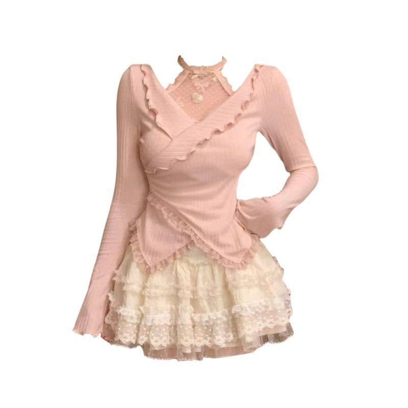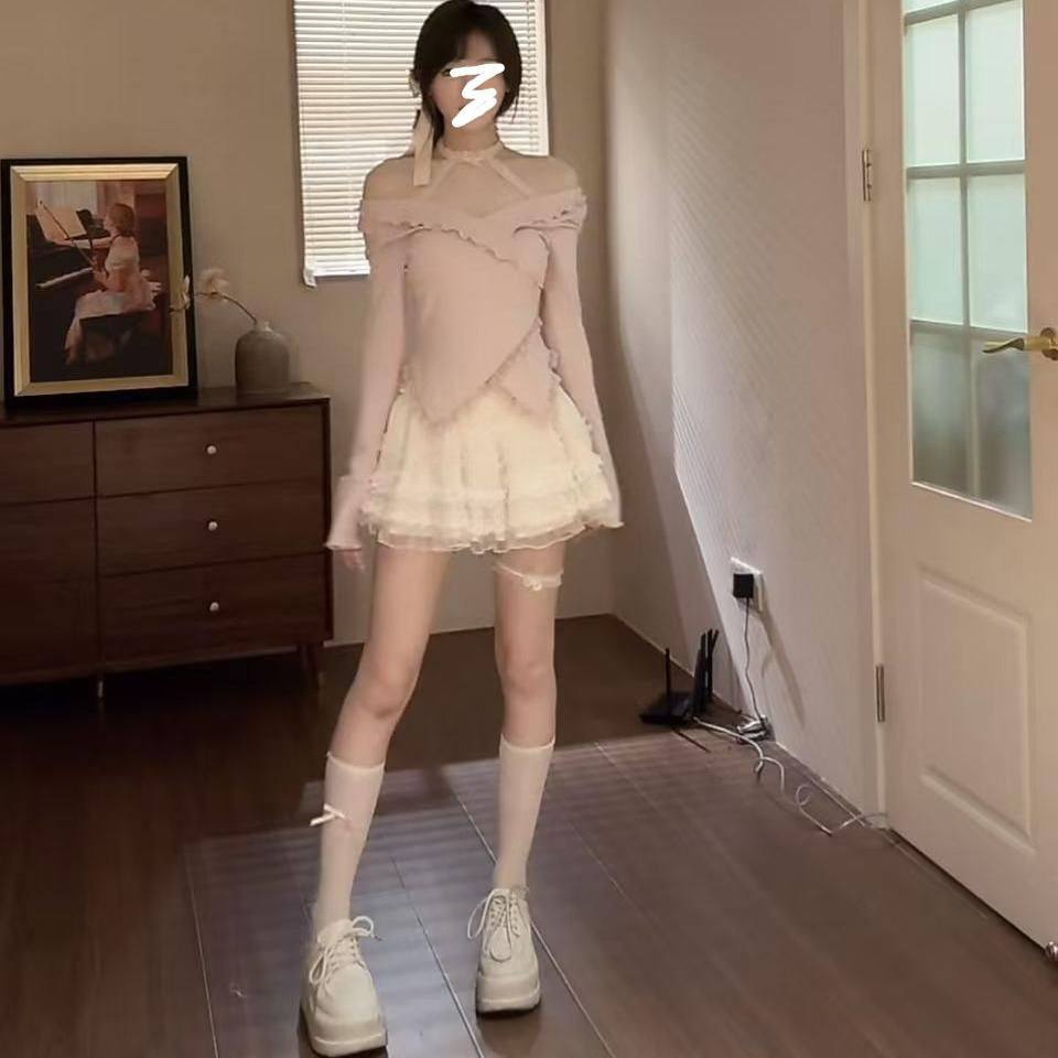 纯欲风甜美木耳边长袖 春秋甜辣风两件套 不规则蕾丝上衣半身裙套装