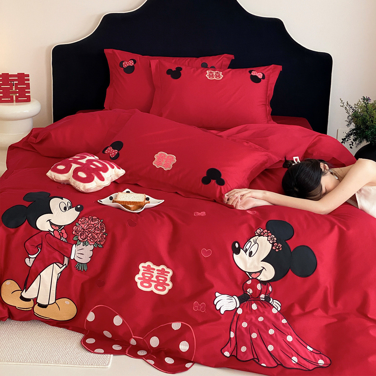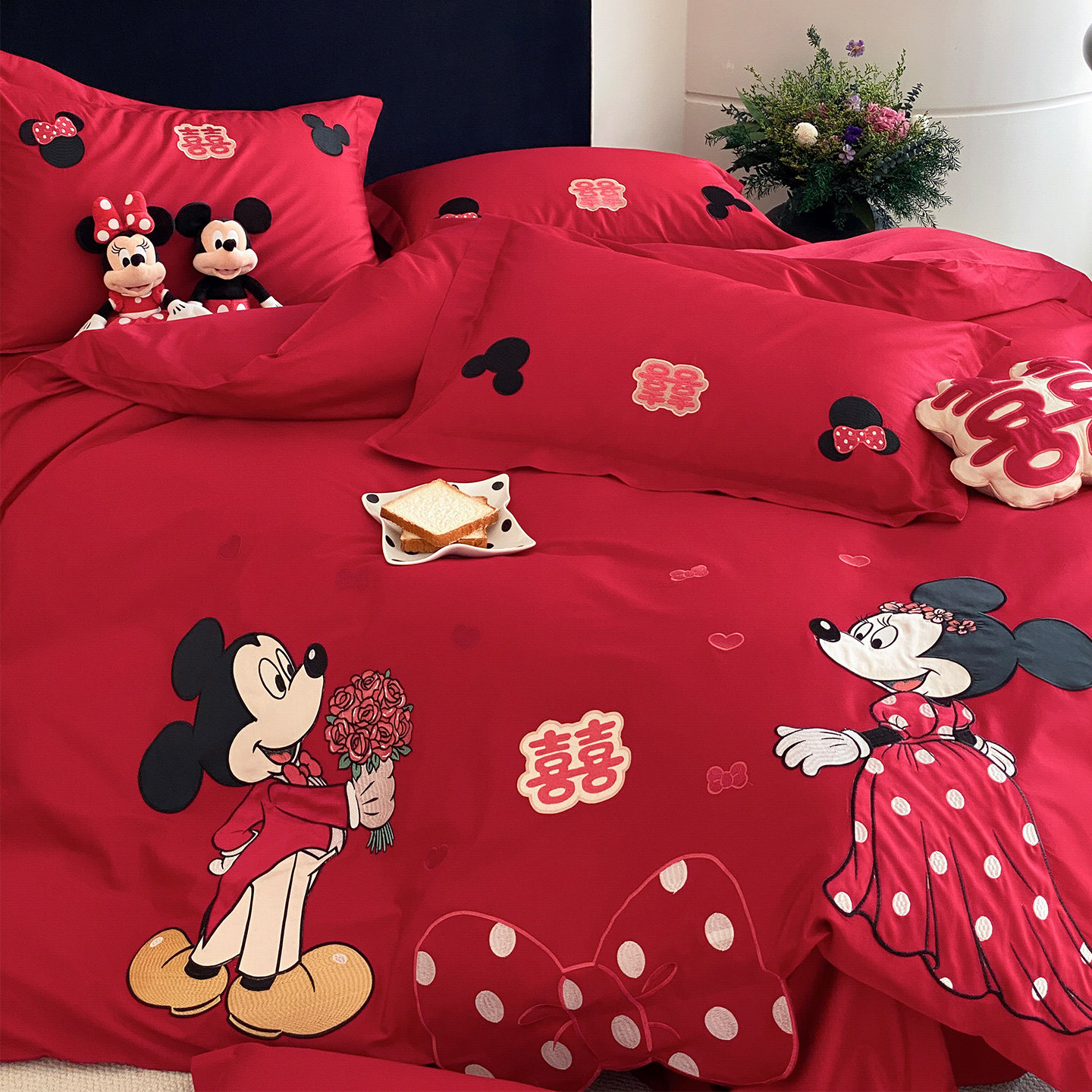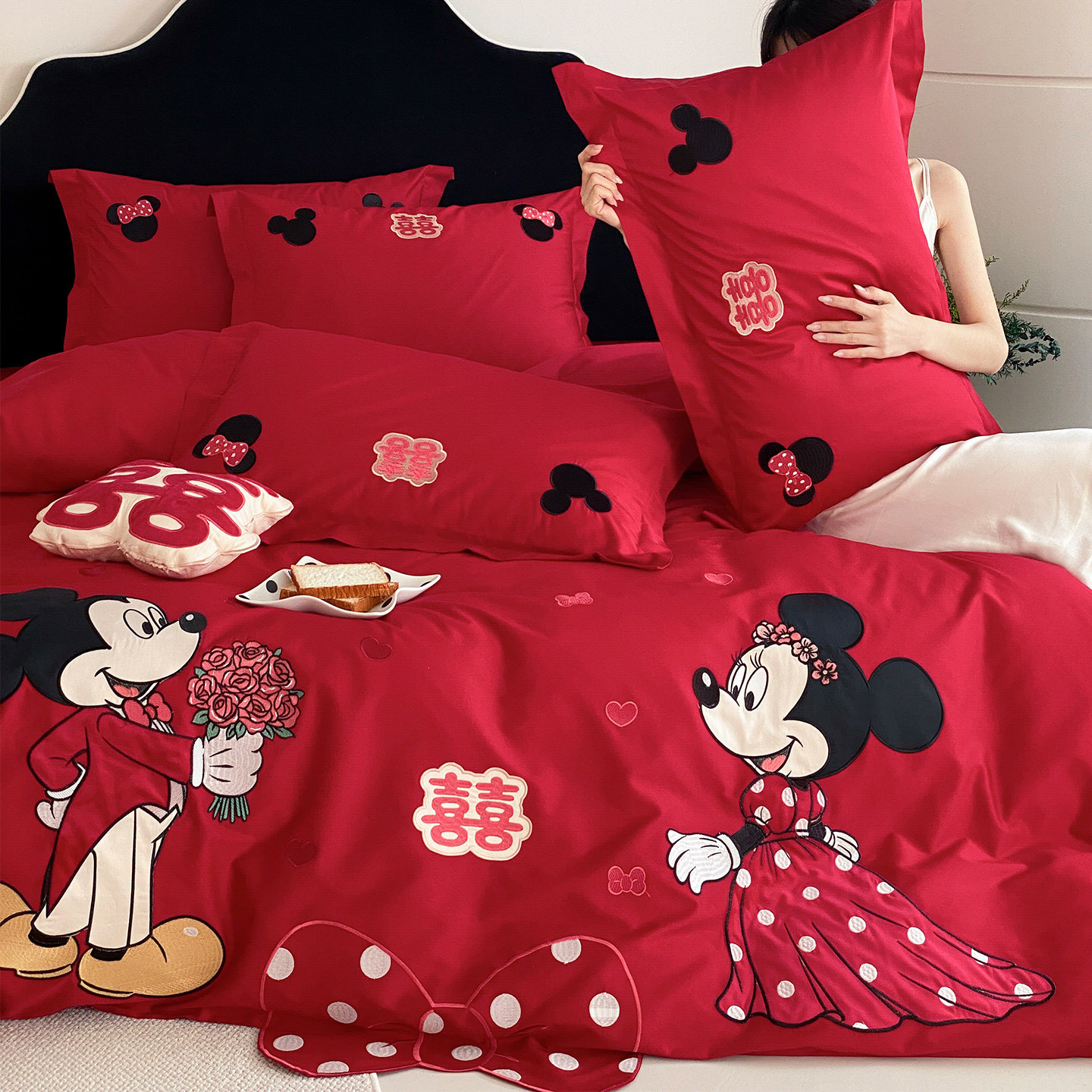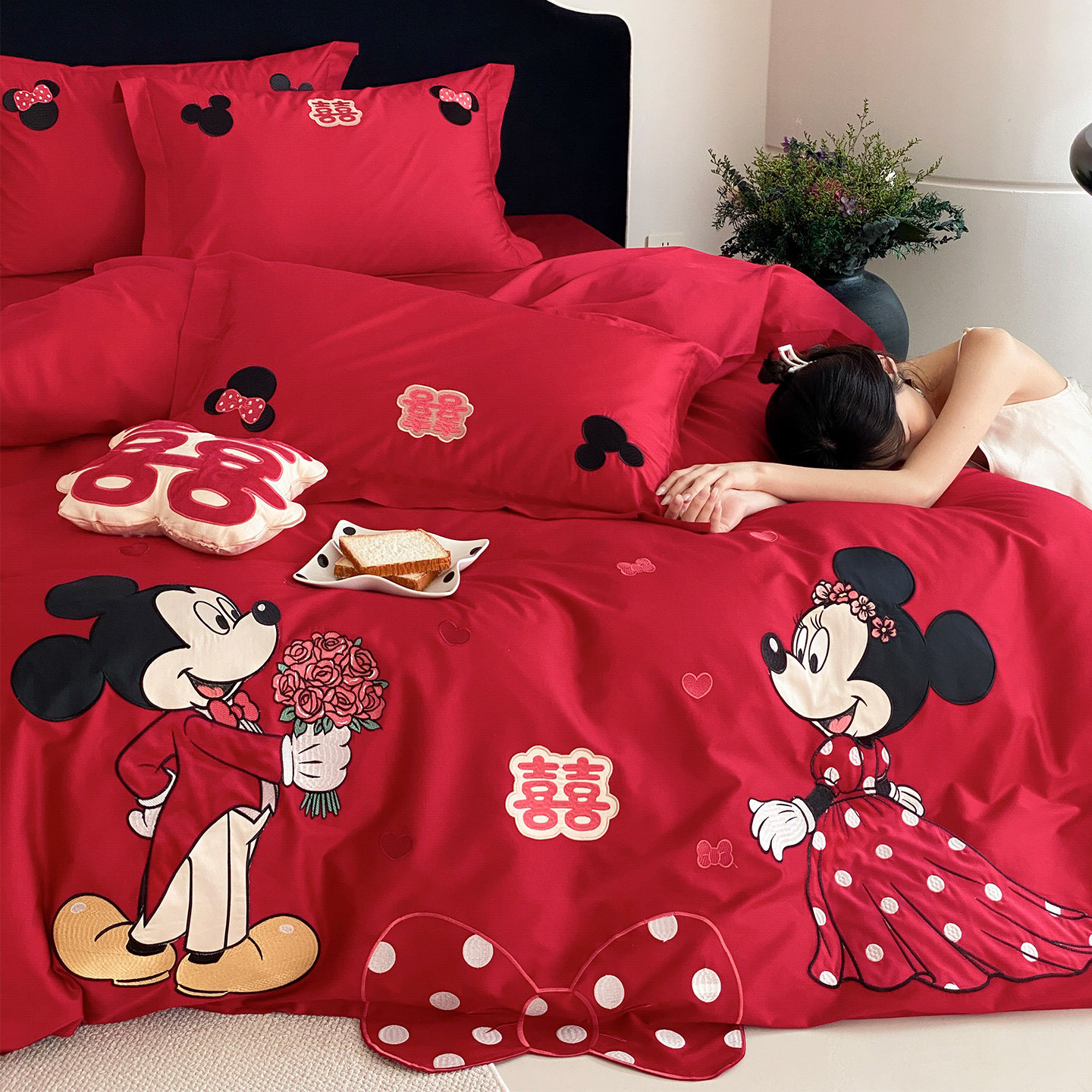 LANSWAY正版 授权米老鼠婚庆四件套红色全棉刺绣喜庆结婚被套床单