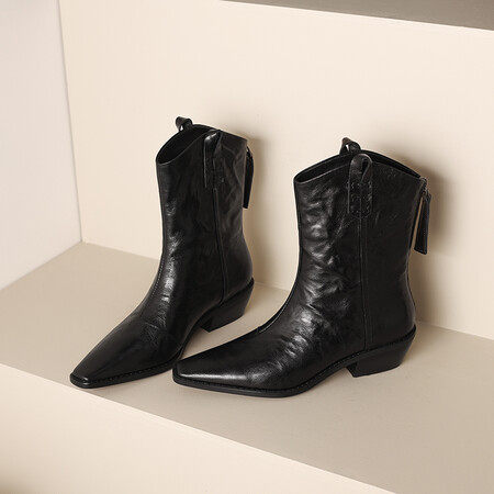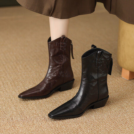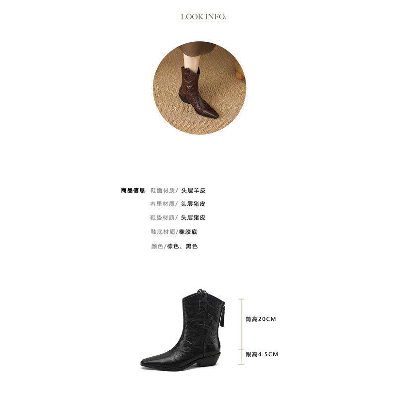 V口显瘦西部牛仔靴4.5c 真皮尖头粗跟短靴女2025秋冬新款 avance