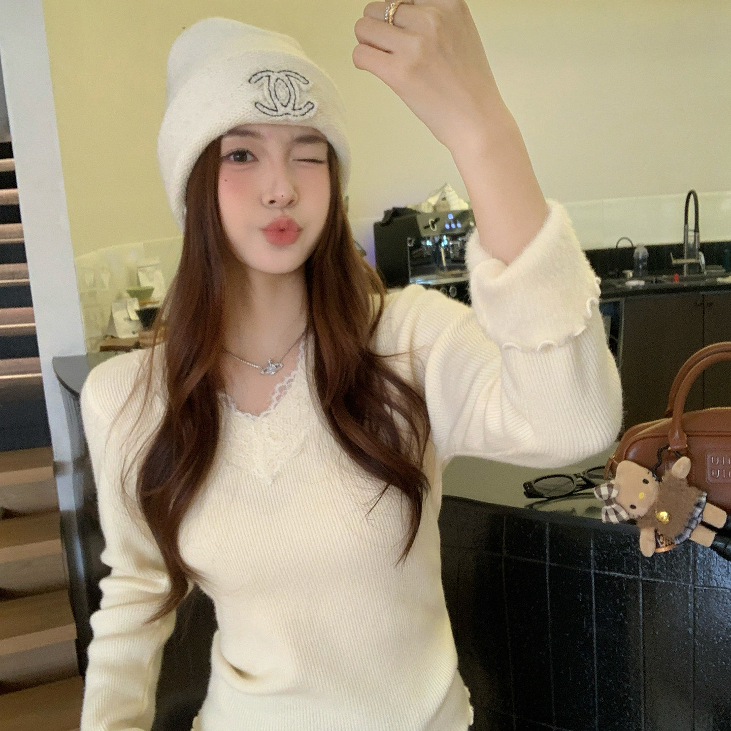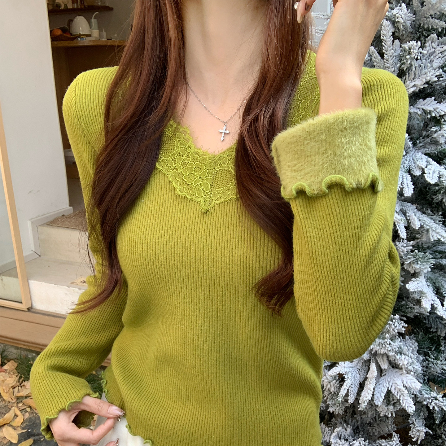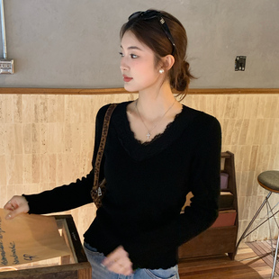 龙妹家燕麦色V领蕾丝加绒加厚打底衫 针织上衣 毛衣女内搭2025新款