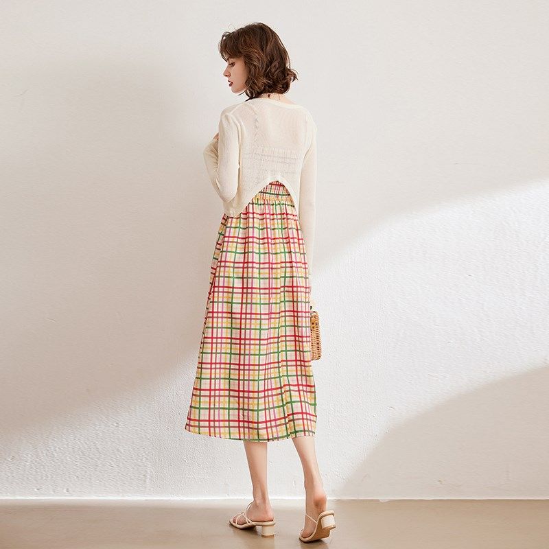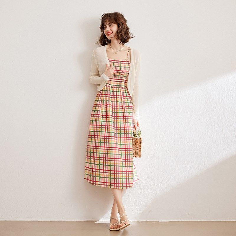 套装 女式 甜美温柔吊带裙针织开衫 白鹿语气质披肩彩格两件套夏季