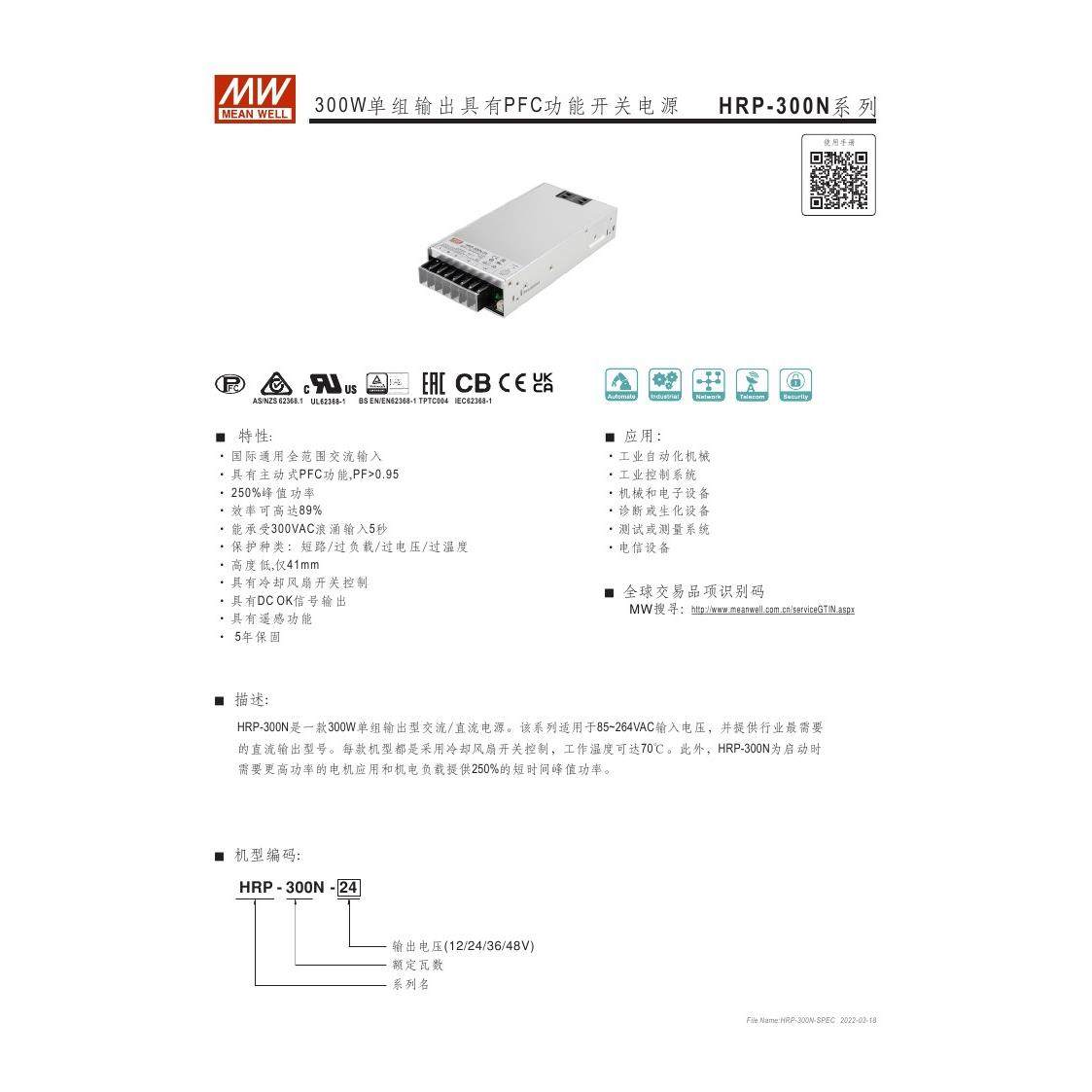 HRP 300N明纬300W开关电源12V24V36V48V带PFC电机250%峰值功率