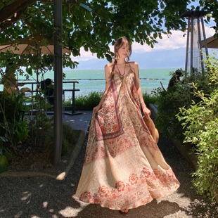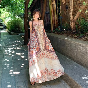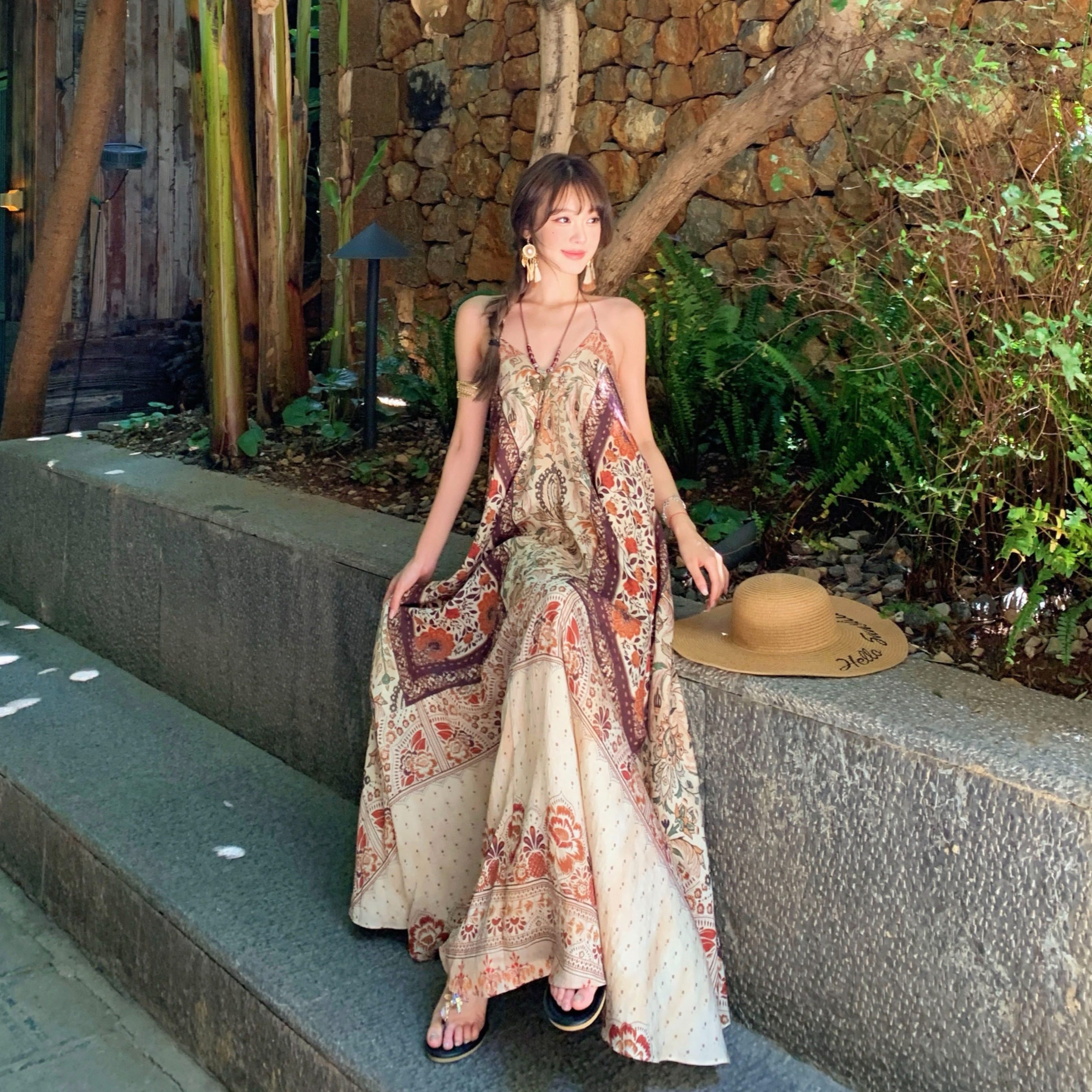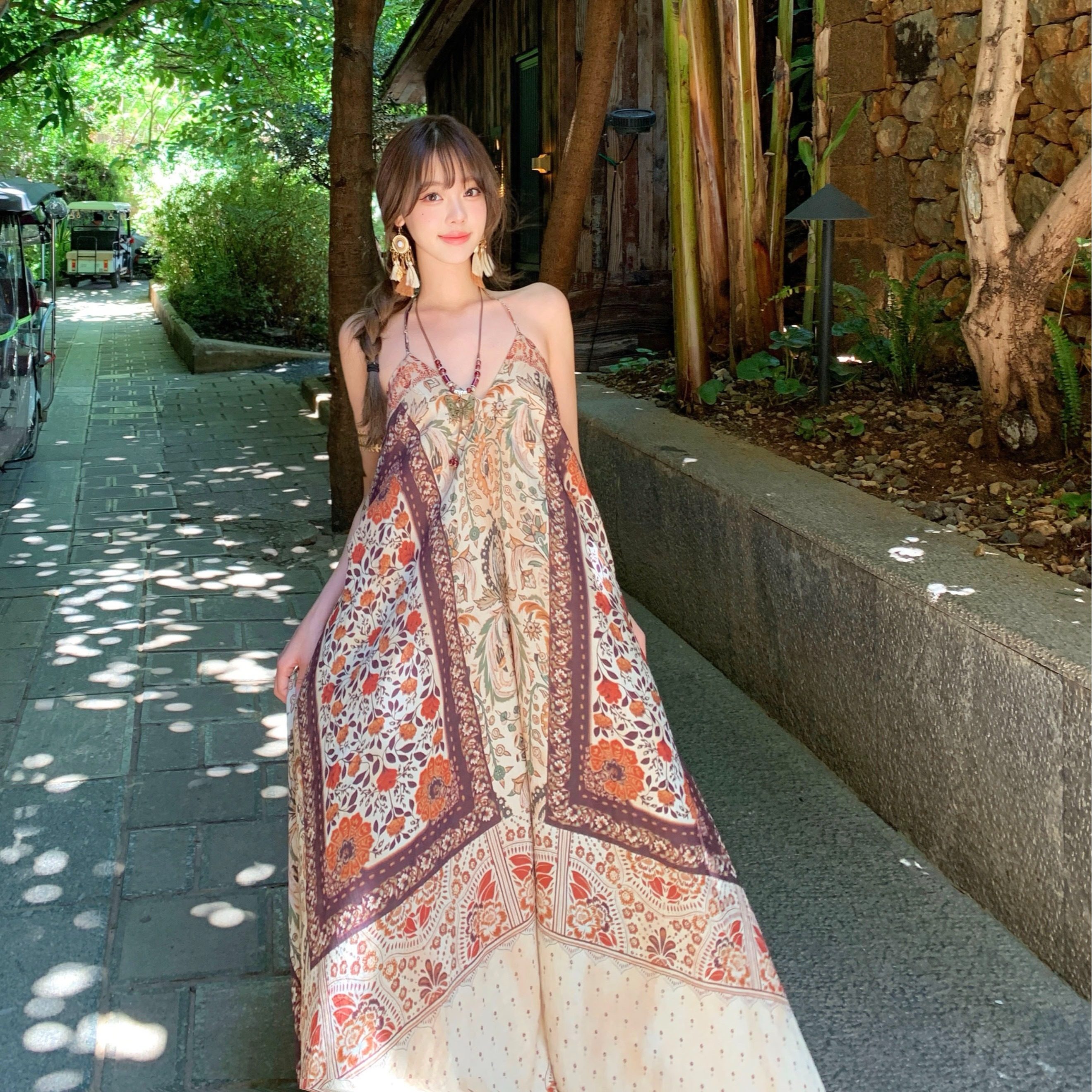 云南旅游波西米亚风连衣裙复古印花异域风挂脖长裙泰国穿搭沙滩裙