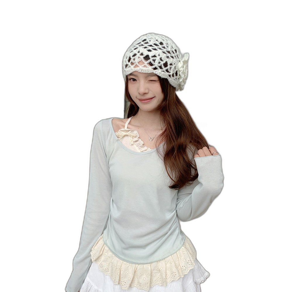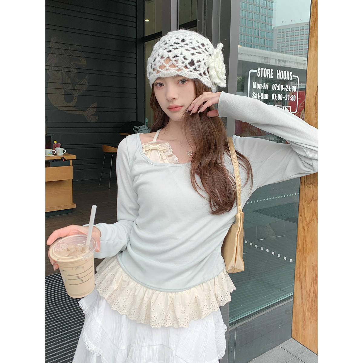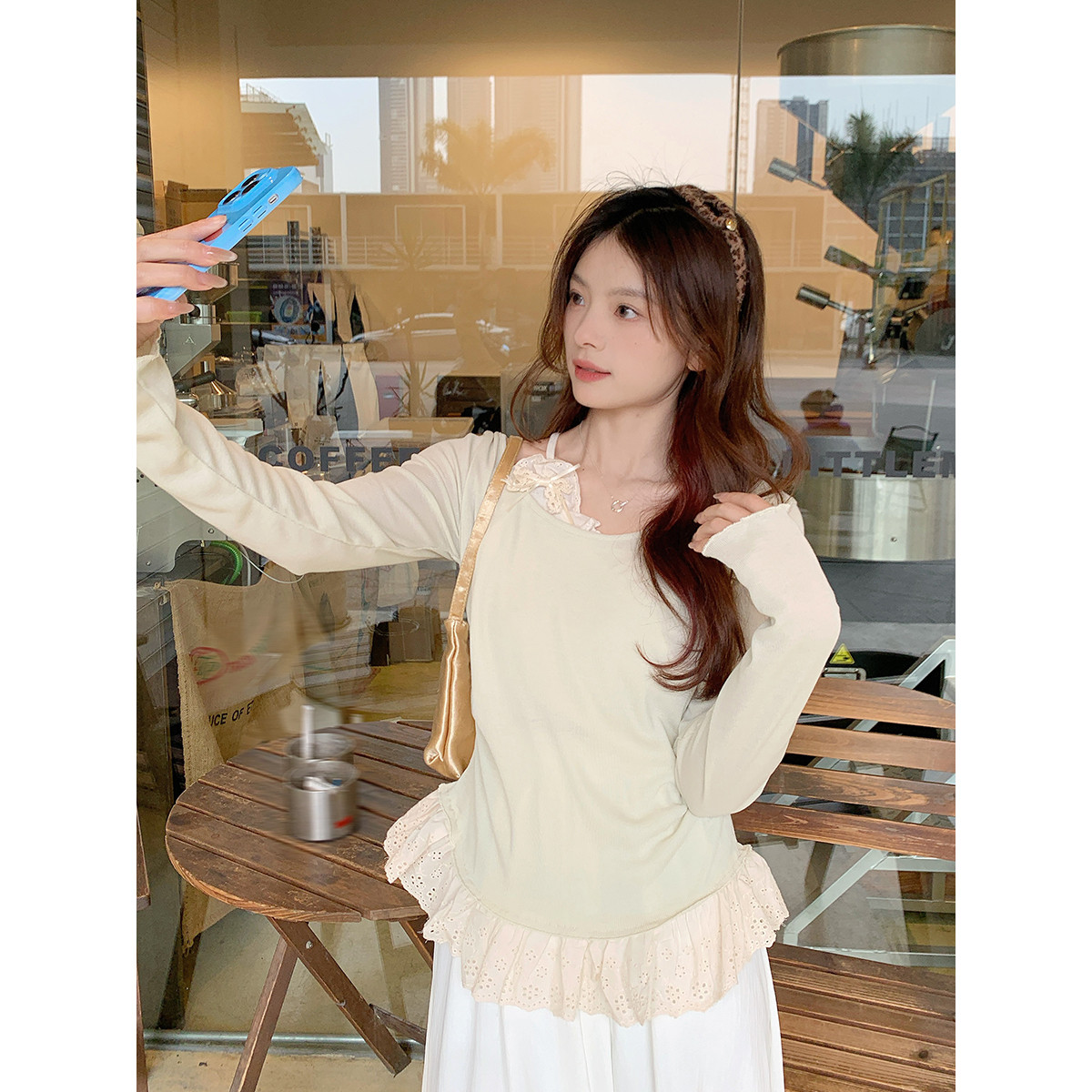 实拍实价纯欲风秋季 上衣设计感小众假两件花边拼接蝴蝶结T恤 新款