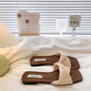 度假风气质坡跟凉拖鞋 厚底方头编织一字拖鞋 女夏外穿法式