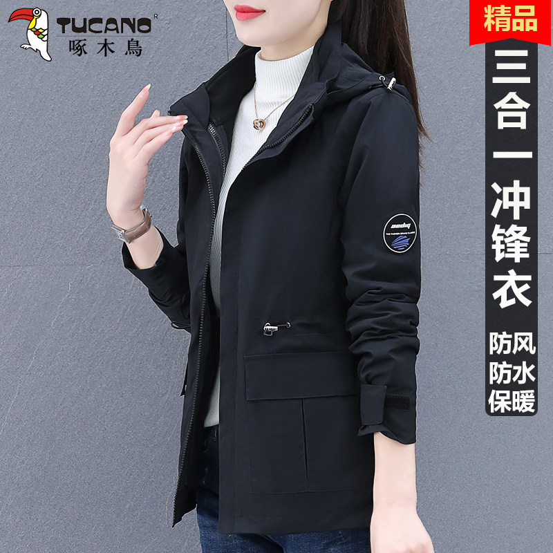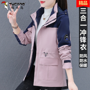 可拆卸加绒加厚防风防水外套女秋冬款 啄木鸟正品 三合一冲锋衣女装