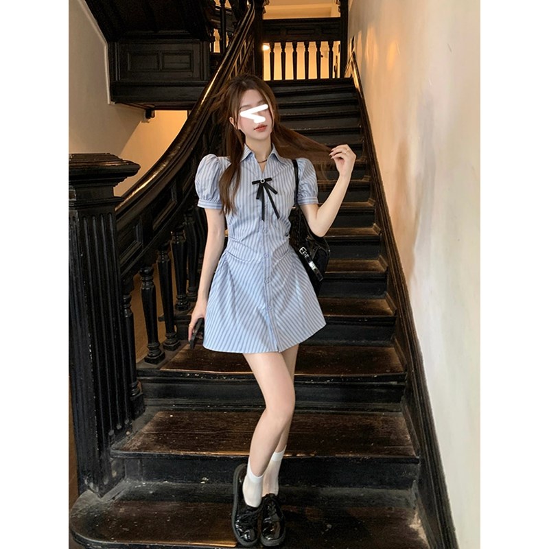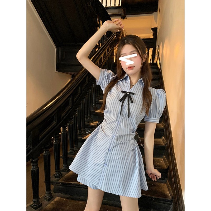 高腰短裤 连衣裙女夏季 气质两件套 收腰显瘦裙子条纹衬衫 学院风套装