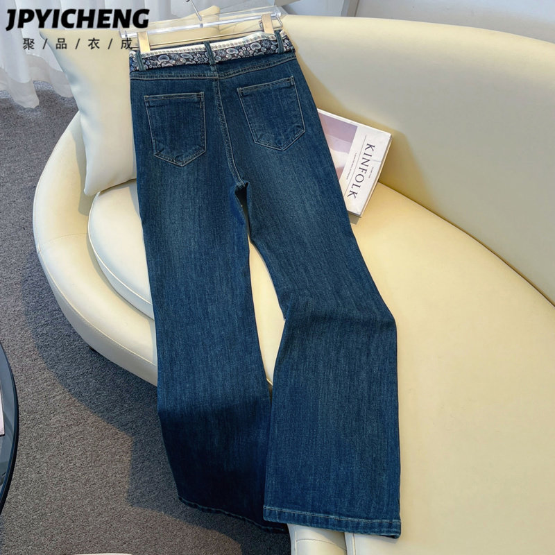 女2025新款 长裤 冬季 马蹄裤 丝带腰带弹力紧身喇叭裤 蓝色微喇牛仔裤