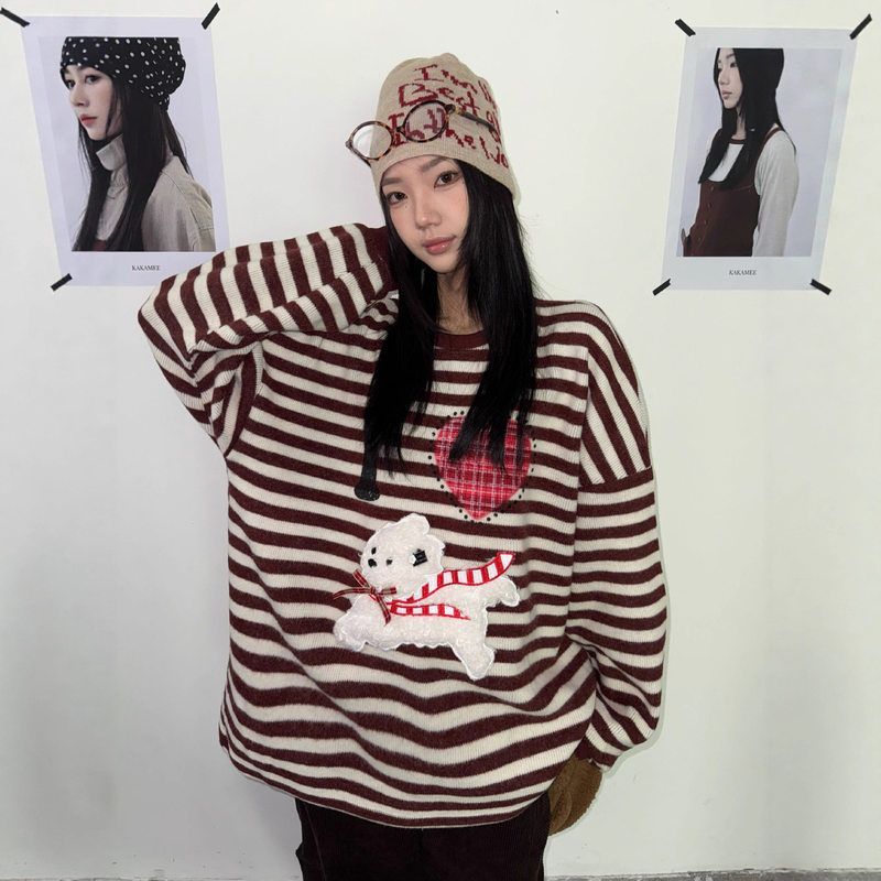 厚实条纹卫衣女8986 KAKAMEE十三行秋冬立体毛绒绒小狗休闲大版