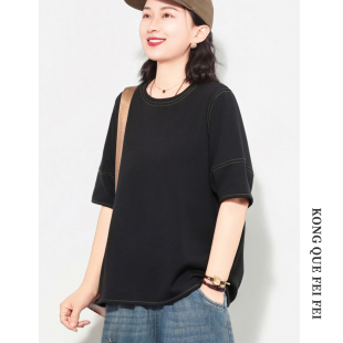 休闲短袖 孔雀飞飞2026夏装 遮肉纯色套头复古气质新款 大码 t恤 韩版