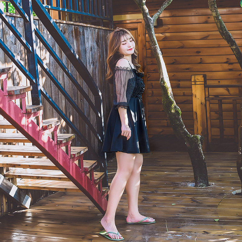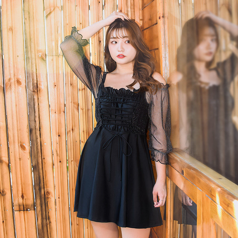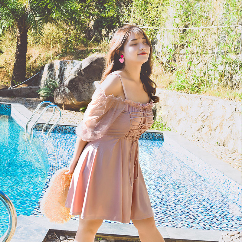 钢圈聚拢连体一字肩 微胖mm200斤遮肉显瘦保守裙式 泳衣女大码 夏季
