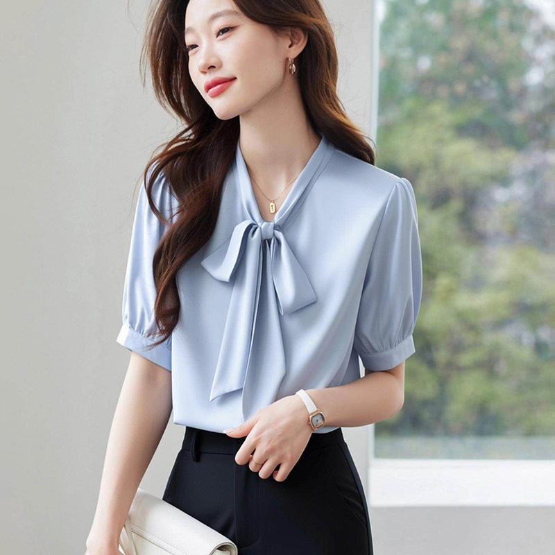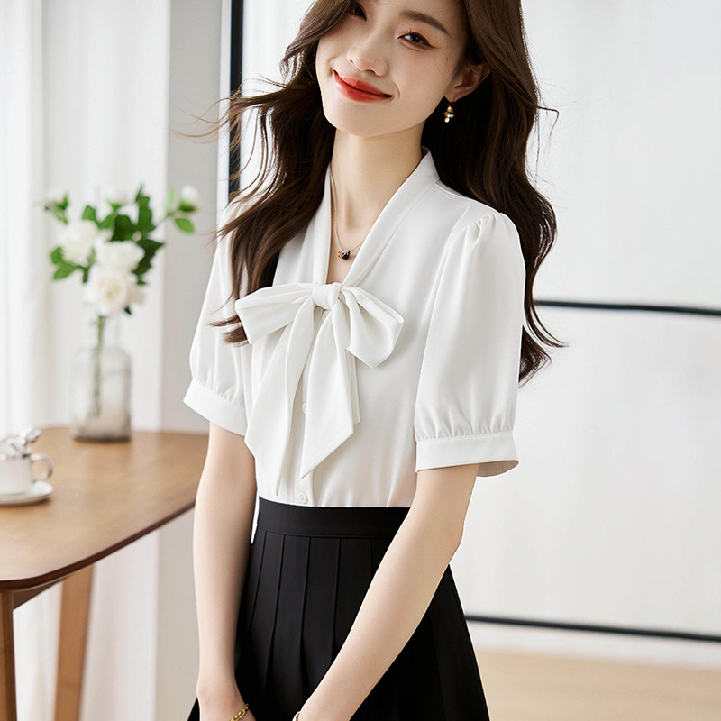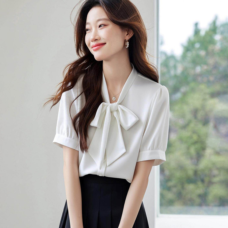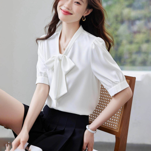 设计感小众港风通勤职业上衣百搭系带 夏季 白色缎面飘带衬衫 女短袖