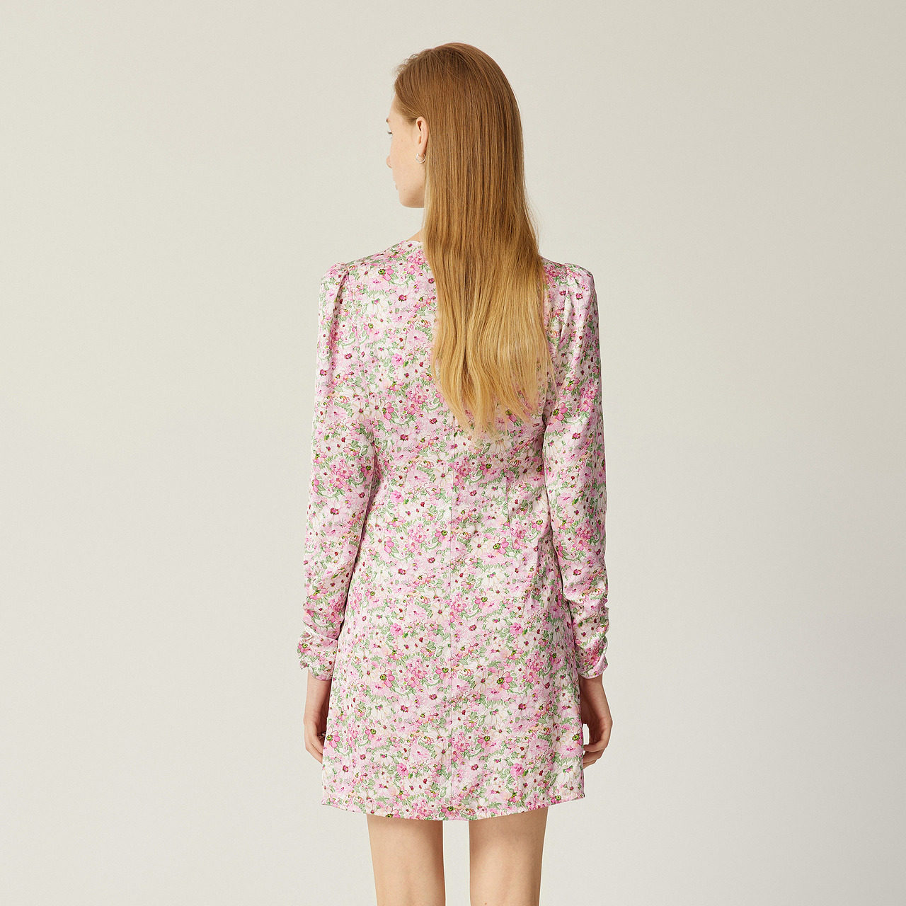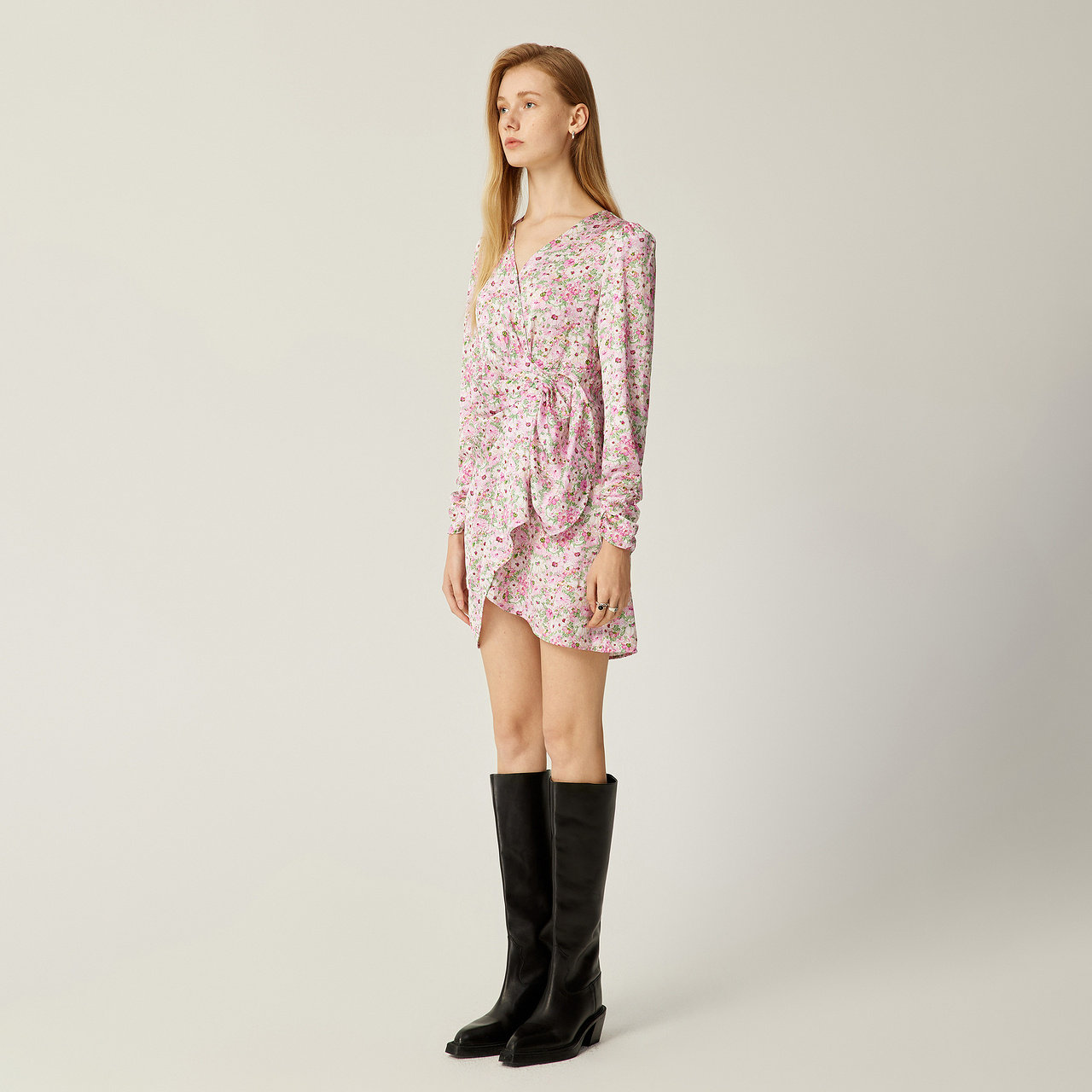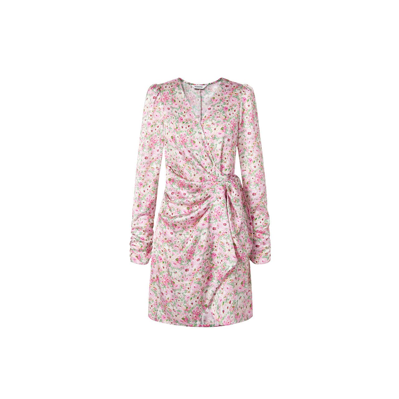商场同款 摩萨克2024春V领樱花粉碎花腰间立体剪裁连衣裙女