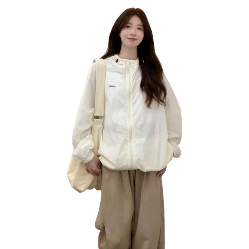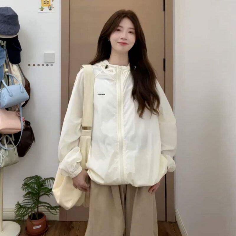 户外运动宽松连帽防晒服上衣 2025年新款 杏色薄款 防晒衣外套女夏季