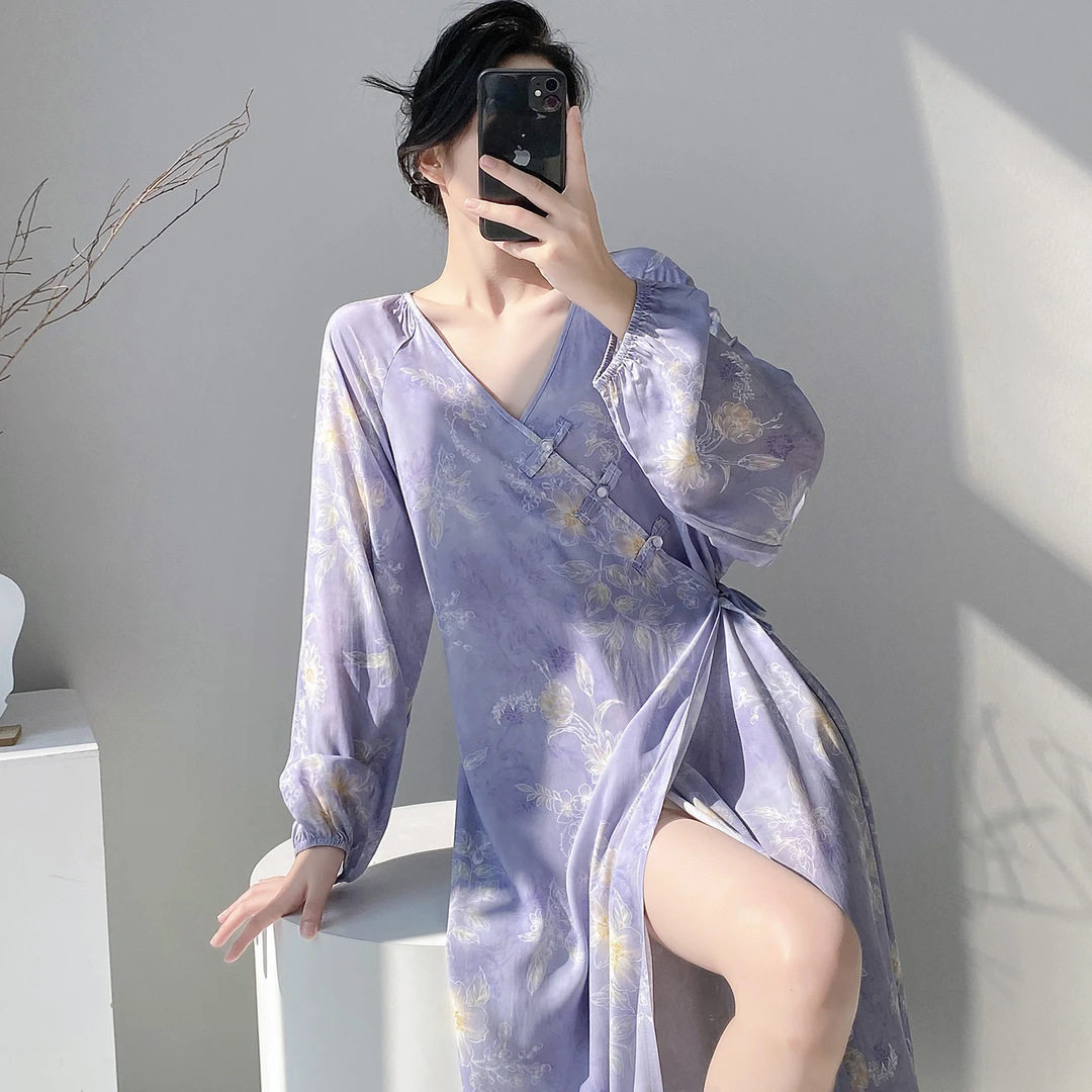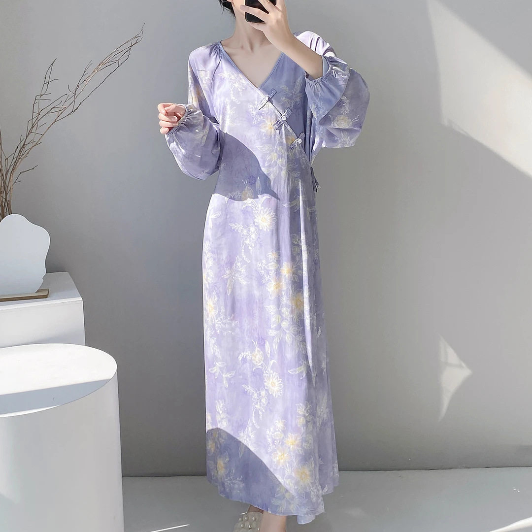 棉绸世家碎花棉绸睡裙女春夏季 睡衣简约舒适国风家居服女 宽松薄款