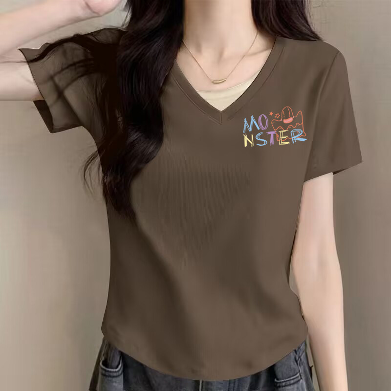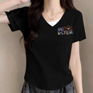 外贸出口清仓100%纯棉假两件V领短袖 t恤女2026夏显瘦洋气宽松上衣