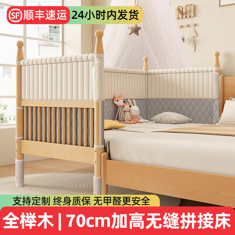 榉木儿童床拼接床婴儿床加宽宝宝床边床拼接大床实木床带护栏小床