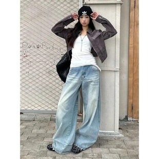 高街潮牌宽松bf风辣妹牛仔裤 女小个子设计感刺绣高腰显瘦直筒长裤