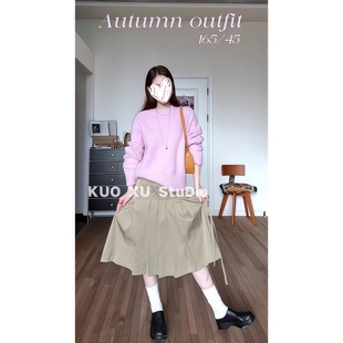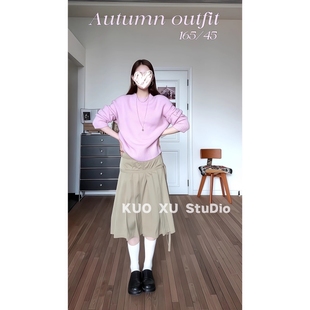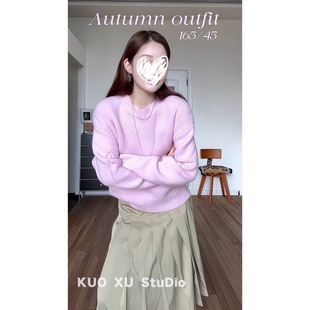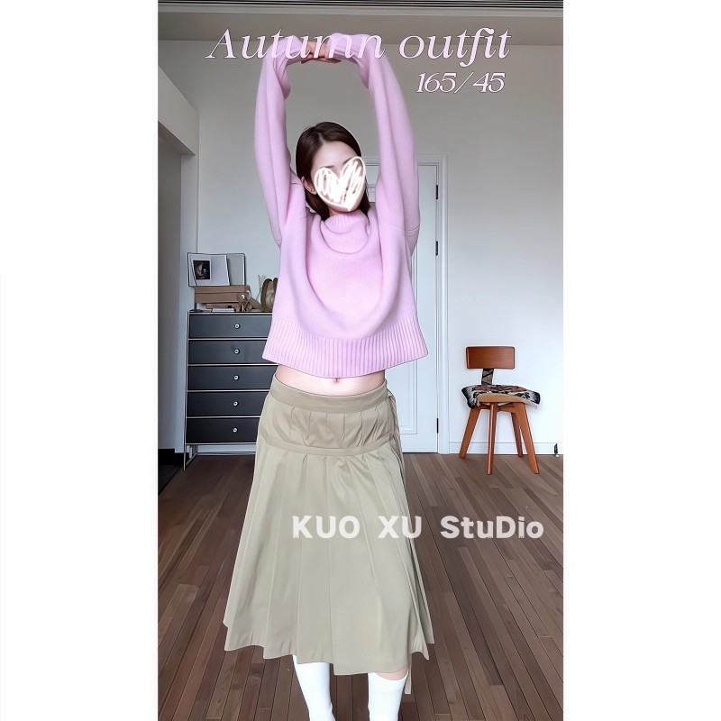 女 半身裙百褶裙套装 秋冬穿搭粉色圆领长袖 针织毛衣高腰系带中长款