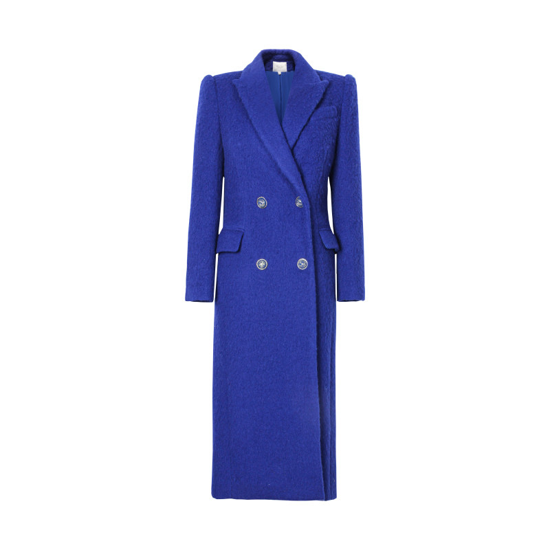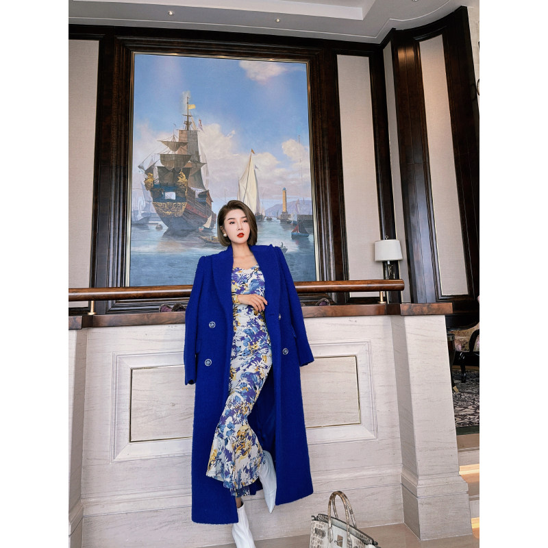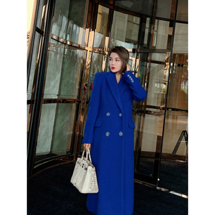 XULU原创进口克莱因蓝混纺绵羊毛气质宽松保暖长袖 平驳领毛呢大衣