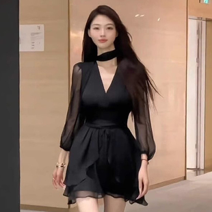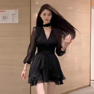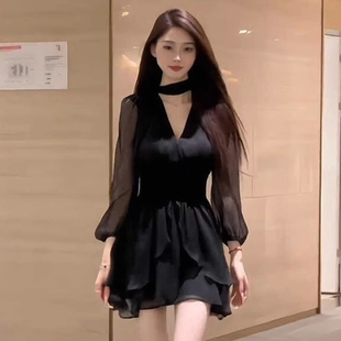 高级感收腰显瘦短裙D0613 连衣裙2025新款 有里布法式 气质黑色长袖