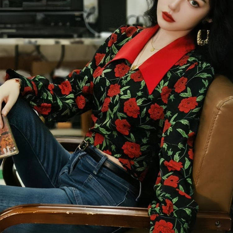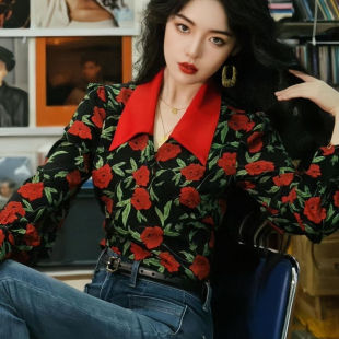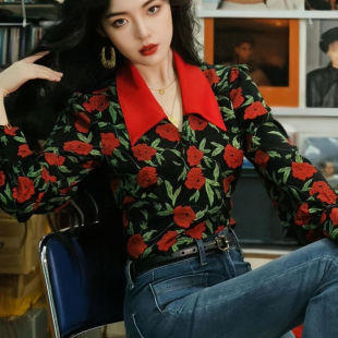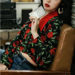 衬衣短款 港风复古气质玫瑰印花长袖 高腰系带修身 女法式 上衣女 衬衫