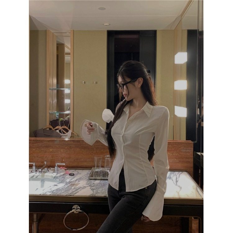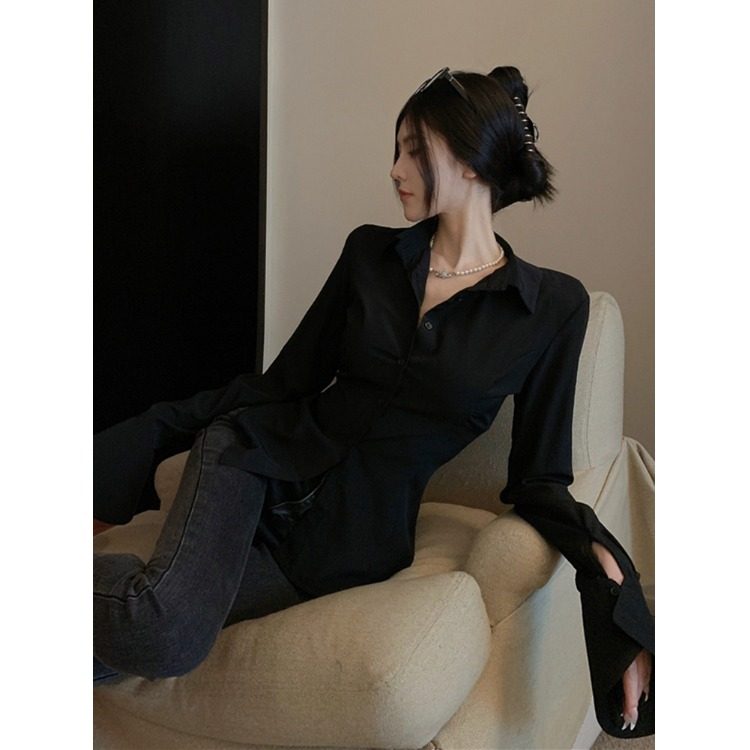 女春季 黑色翻领衬衫 高级感辣妹收腰绑带显身材上衣 气质喇叭袖 法式
