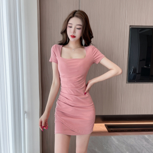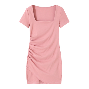 辣妹穿搭性感低胸方领连衣裙褶皱遮肉设计感收腰显瘦紧身包臀裙子